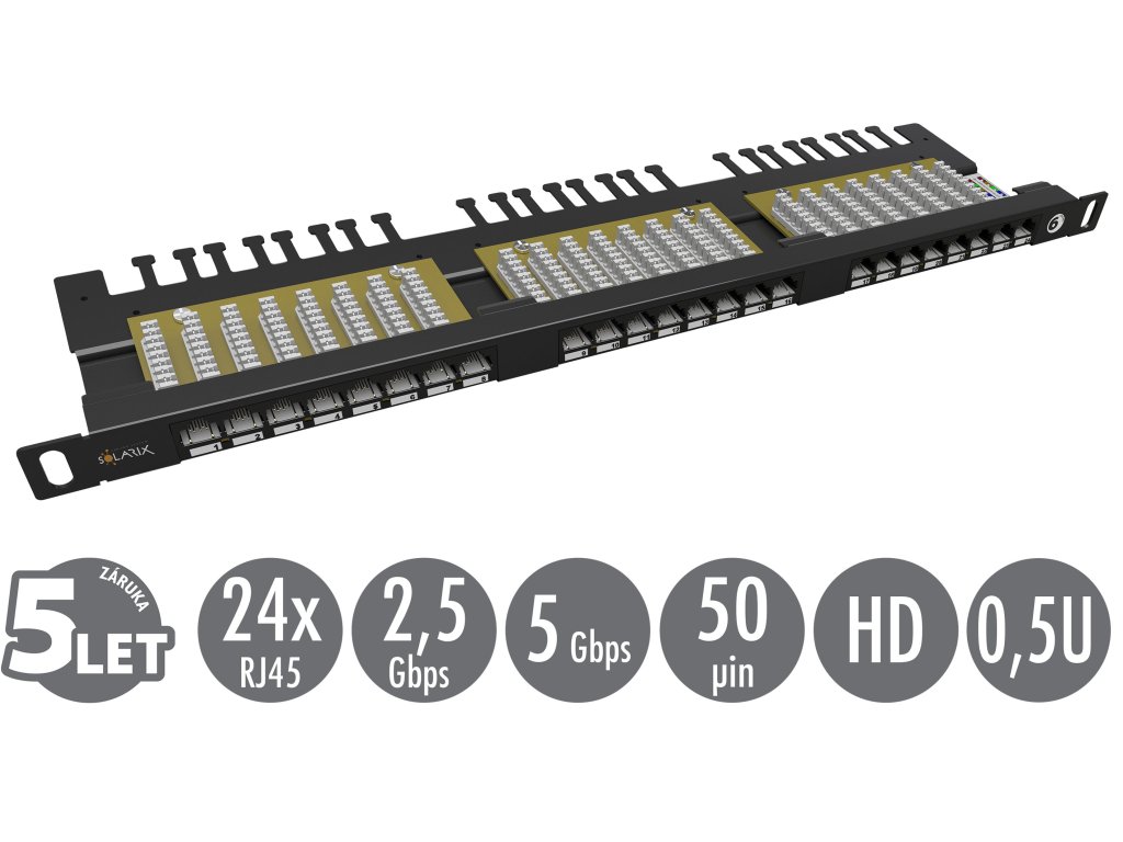Patch panely Solarix s označením SX24HD-6-UTP-BK jsou vysokohustotní 19'' patch panely s výškou 0,5U, které jsou osazeny 24 porty RJ45 a duální IDC svorkovnicí 110/Krone. U těchto panelů je důraz kladen na maximální úsporu místa v rozvaděči, kdy do výšky 1U lze jednoduše nainstalovat až 48 portů. Tyto high-density panely Solarix jsou dostupné ve stíněném i nestíněném provedení a bez problémů splňují požadavky definované v mezinárodních standardech ANSI/TIA 568, ISO/IEC 11801 a EN 50173 včetně všech nejnovějších dodatků pro kategorii 6 a třídu vedení Class E. Panely jsou navrhnuty tak, aby byly robustní, spolehlivé, poskytovaly maximální výkon a umožňovaly jednoduchou instalaci. Součástí těla těchto panelů je vyvazovací lišta, která umožňuje pevné uchycení a přehledné uspořádání datového kabelu. Barva nestíněného high-density patch panelu Solarix je černá. Technické parametry Kategorie: CAT6 Podporované protokoly: 2.5/5GBASE-T a nižší Počet portů: 24 Stínění: ne Vyvazovací lišta: ano Min. životnost portu: 1 000 zapojení/odpojení Krytí kontaktů: 50 µ zlata a 100 µ niklu Svorkovnice: duální 110/Krone 8p8c Min. životnost svorkovnice: 200 zařezání Velikost a typ vodiče: AWG 26 - 22, drát Materiál nekovových částí: FR plast podle UL94-0 Barva: černá Velikost: 0,5U Výška: 22 mm Šířka: 484 mm Hloubka: 100 mm Skladovací teplota: -40 až 70 °C Provozní teplota: -10 až 60 °C Max. provozní vlhkost: 93 % Balení: 1 ks, kartónový obal Rozměry balení (výška x šířka x hloubka): 35 mm x 540 mm x 125 mm Přepravní balení: 14 ks, kartónový box Rozměry přepravního balení (výška x šířka x hloubka): 240 mm x 550 mm x 270 mm Montážní sada v balení: 2x M6Dodatočné parametre