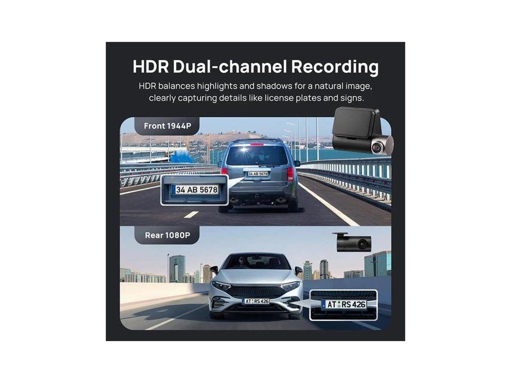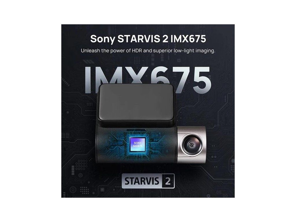Kamera do auta - se snímačem sony IMX675 1/2,8", rozlišení snímače 5,12 Mpx, úhel záběru 138°, 2" displej, akumulátorové napájení, GPS, detekce nárazu, parkovací režim, noční vidění, g-senzor a GLONASS, max. rozlišení videa 2592×1944, max. snímkovací frekvence 60 FPS, stereo ozvučení videa, kompatibilní s paměťovou kartou micro SD do velikosti 256 GB, podporovaný formát H.264, MP4 a H.265, bezdrátové rozhraní Wi-Fi a bezdrátové rozhraní Bluetooth, USB kabel, manuál, nabíječka do auta, zadní kamera a lepicí podložky v balení, napájení zajišťuje zásuvka autozapalovače, kapacita baterie 500 mAh. Set přední a zadní kamery do autaZáznam s rozlišením 3K 1944P přední kamery a Full HD zadní kamery