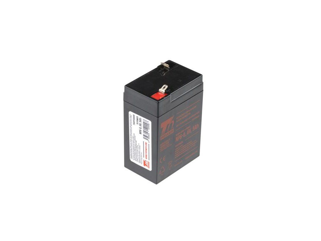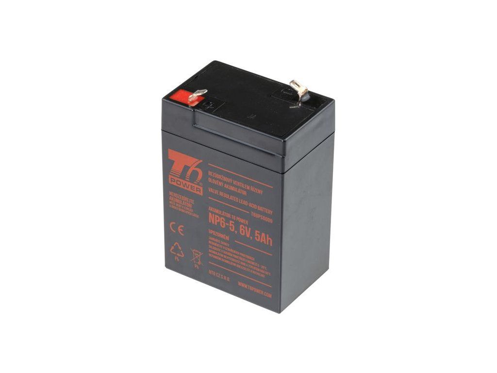 Napětí: 6 V Kapacita: 5 Ah Typ pólu: Faston 4,7 mm Výška: 107 mm Šířka: 70 mm Hloubka: 48 mm Hmotnost: 0,84 kg Životnost: 3-5 let Akumulátor T6 Power NP6-5 je uzavřeným akumulátorem typu VRLA. Díky své velikosti je tento typ akumulátoru vhodný například pro napájení nouzových světel, požárních záložních systémů a dalších systémů, které vyžadují akumulátor o napětí 6V a kapacitě 5Ah. Akumulátor je možné používat v libovolné pozici. Důležité: Uzavřené bezúdržbové akumulátorové baterie VRLA nelze nabíjet běžnou nabíječkou na autobaterie. Pro nabíjení použijte vhodnou nabíječku na bezúdržbové baterie.Dodatočné parametre
