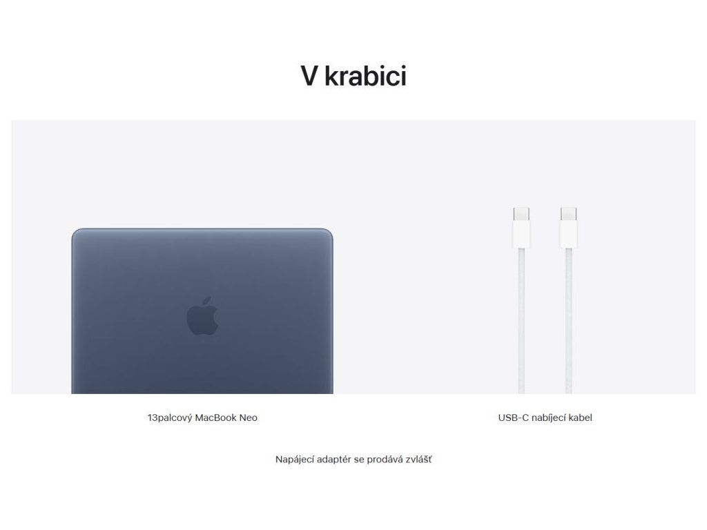 MacBook Neo, USB-C nabíjecí kabel (1,5 m). Napájecí adaptér se prodává zvlášť, minimální příkon pro nabíjení je 20 W.