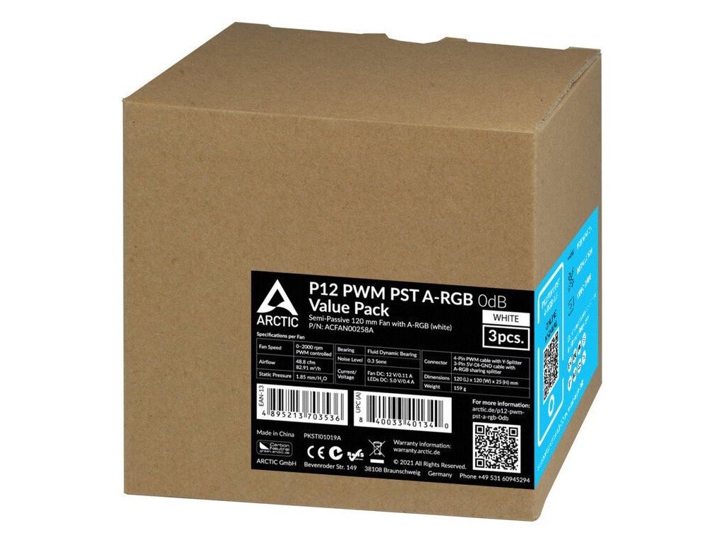 Ventilátor do PC skríň s ARGB osvetlením, rozmery 120 x 25 mm, rýchlosť 0-2000 RPM, prietok vzduchu až 48,8 CFM, fluidné dynamické ložisko, 4-pin PWM a 3-pin ARGB konektor; sada 3 kusov