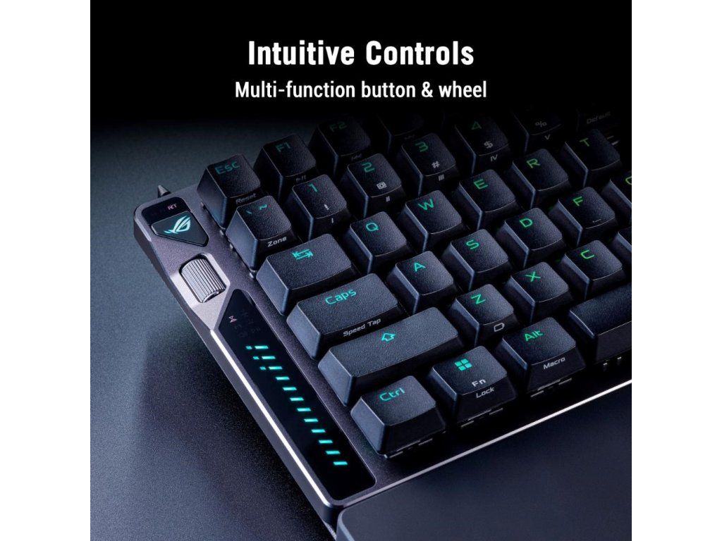 - Intuitívne ovládanie: Okamžité nastavenie aktivačného bodu, citlivosti Rapid Trigger, hlasitosti, médií a osvetlenia klávesnice pomocou multifunkčného kolieska a tlačidla