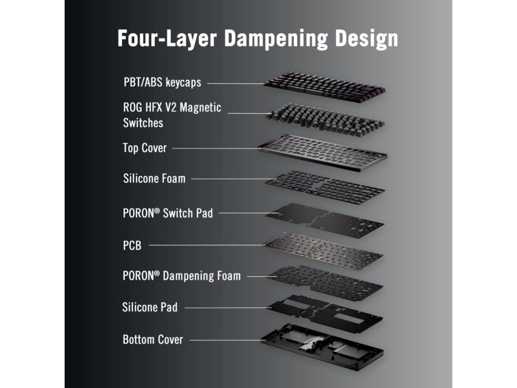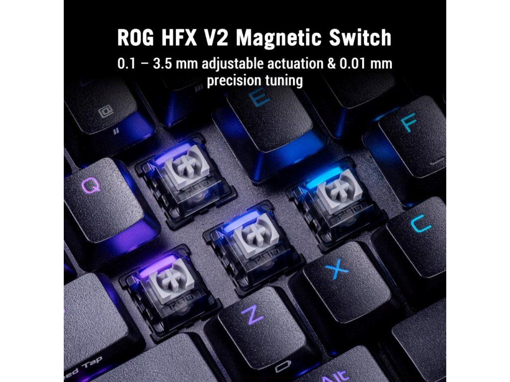 - Magnetický spínač ROG HFX V2 s možnosťou výmeny počas prevádzky: Vylepšené stlačenia kláves s nastaviteľnou aktiváciou 0,1–3,5 mm a presným ladením v krokoch po 0,01 mm