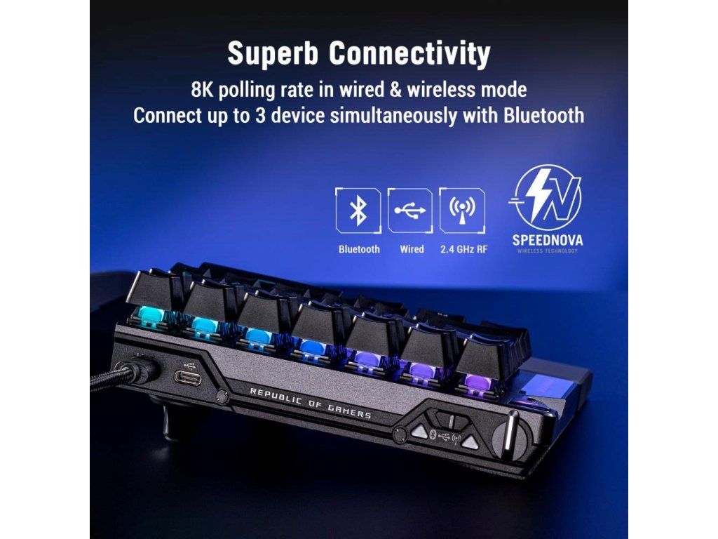 - Výnimočná konektivita: Bezdrôtová technológia ROG SpeedNova 8K, káblové pripojenie USB a Bluetooth podporujú až päť zariadení súčasne; káblový a bezdrôtový režim ponúkajú až 8K polling rate