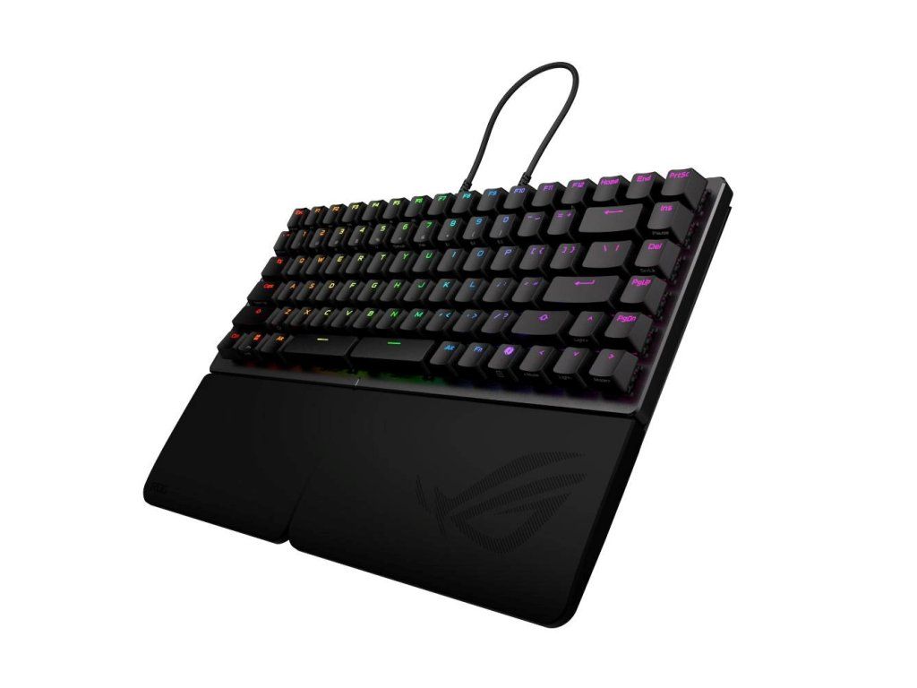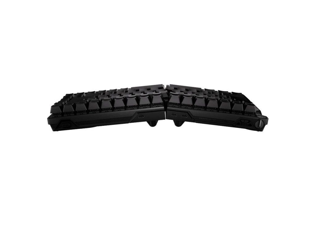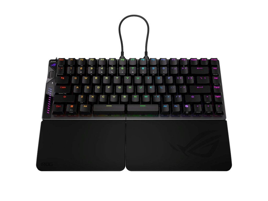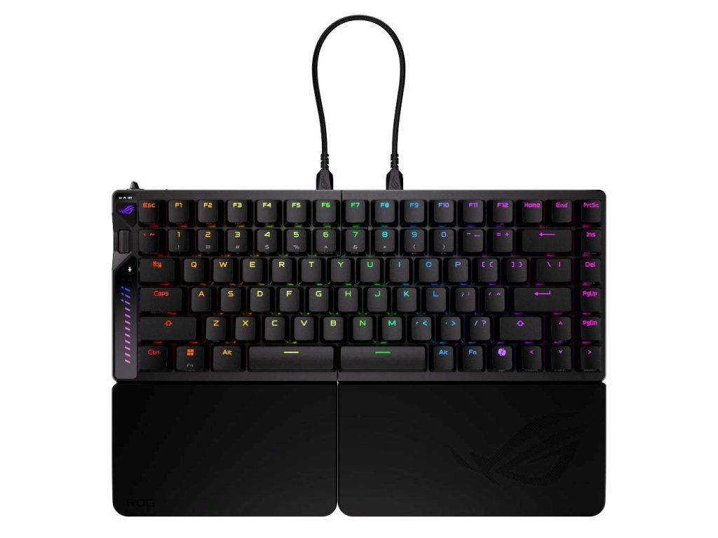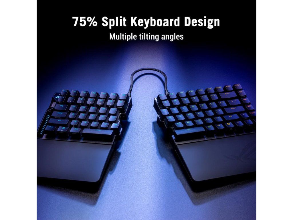 Herná klávesnica ROG Falcata 75 % s rozdelenou klávesnicou, magnetickými spínačmi ROG HFX V2 s možnosťou výmeny počas používania a snímačom ROG Hall Sensor; vybavená prepínačom Rapid Trigger, intuitívnym ovládaním a multifunkčným kolieskom, troj režimovým pripojením s bezdrôtovou technológiou ROG SpeedNova 8K, režimom Zone Mode, štyrvrstvovým tlmením a odnímateľnými silikónovými opierkami zápästia