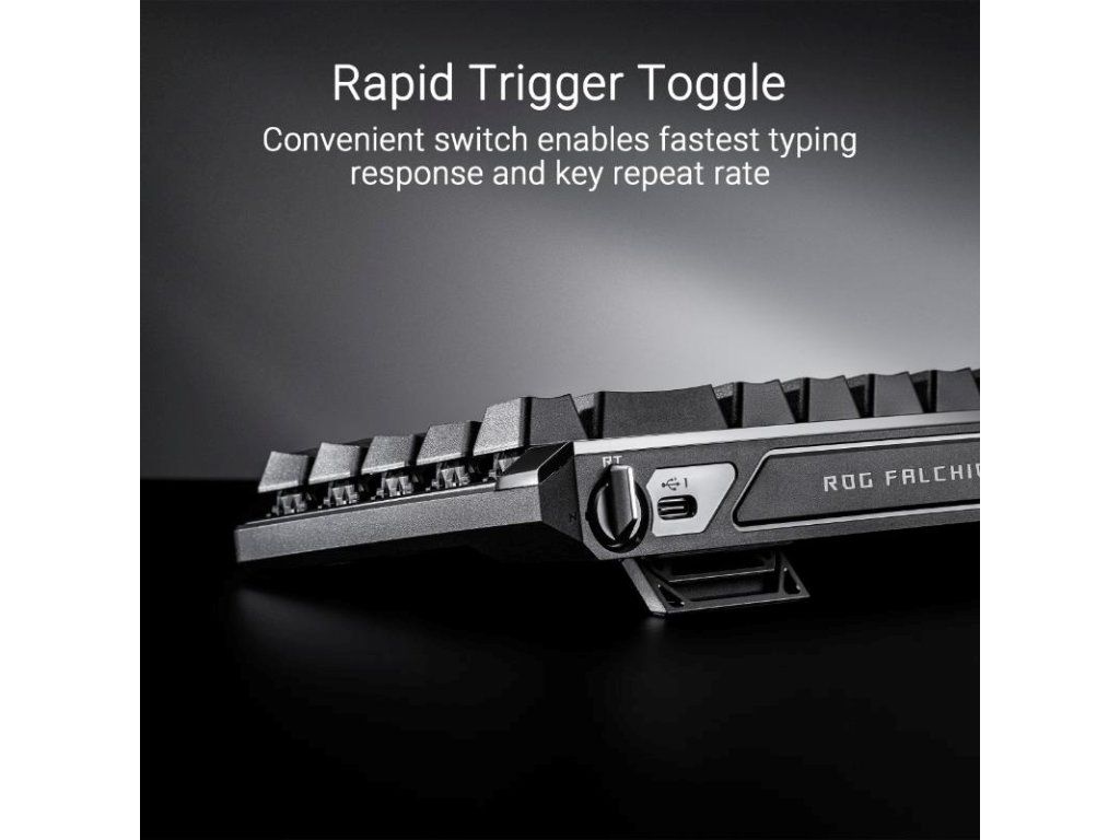 ROG Falchion Ace HFX 65% analógová herná klávesnica s magnetickými spínačmi ROG HFX, prepínač Rapid Trigger, režim Speed ??Tap, interaktívny dotykový panel, obnovovacia frekvencia 8000 Hz, päťvrstvové tlmenie a silikónové tesnenie, duálne porty Type-C, tri uhly sklonu a krycie puzdro