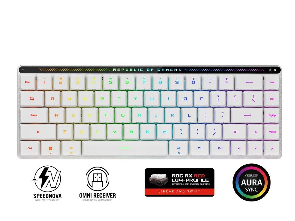 - Nízkoprofilové optické spínače ROG RX: Prednamazané červené a modré spínače RX majú centralizované osvetlenie a poskytujú konzistentný stisk kláves bez kolísania s takmer nulovým oneskorením odskoku
