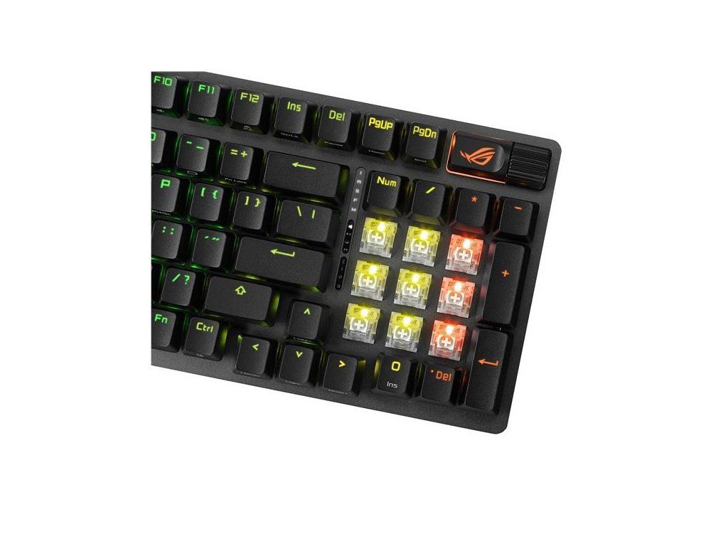 - Vylepšené možnosti písania: Predmazaané stabilizátory klávesnice produkujú menšie trenie pre hladšie stlačenie kláves a stabilitu pre dlhšie klávesy; odolné krytky kláves ROG PBT doubleshot alebo krytky kláves ABS s UV vrstvou ponúkajú prvotriedny pocit a odolnosť voči lesku