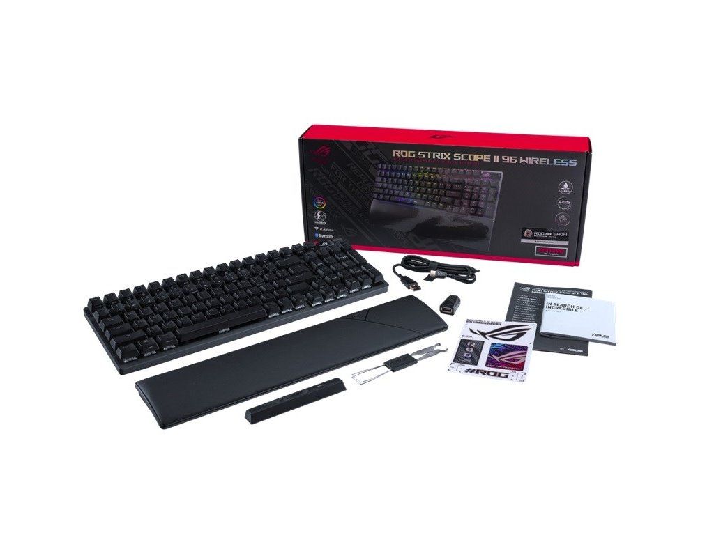 Bezdrôtová herná klávesnica ROG Strix Scope II 96 s pripojením v troch režimoch, klávesové skratky pre streamovanie, multifunkčné ovládacie prvky, mechanické spínače ROG NX s možnosťou výmeny za prevádzky, stabilizátory klávesnice ROG, krytky kláves PBT doubleshot a silikónová tlmiaca pena, tri uhly sklonu a opierka zápästia
