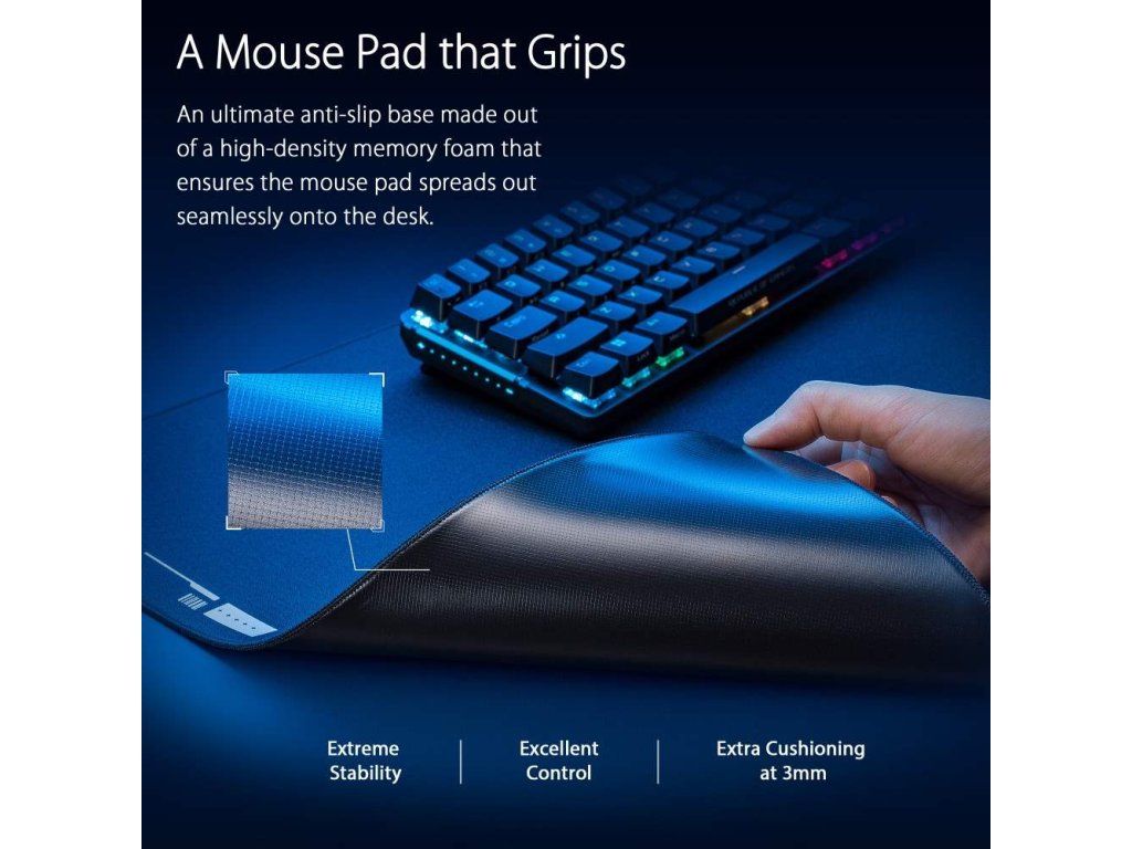Herná podložka pod myš ROG Hone Ace XXL Aim Lab Edition je navrhnutá tak, aby spolupracovala s úlohou Aim Lab X ROG 360 a pomáhala hráčom zlepšiť ich zamieranie. Hone Ace XXL má hybridný textilný povrch pre hladší sklz a lepšiu kontrolu, povrchovú ochrannú nano vrstvu odpudzujúcu vodu, olej a prach a mäkkú protisklzovú gumovú základňu.