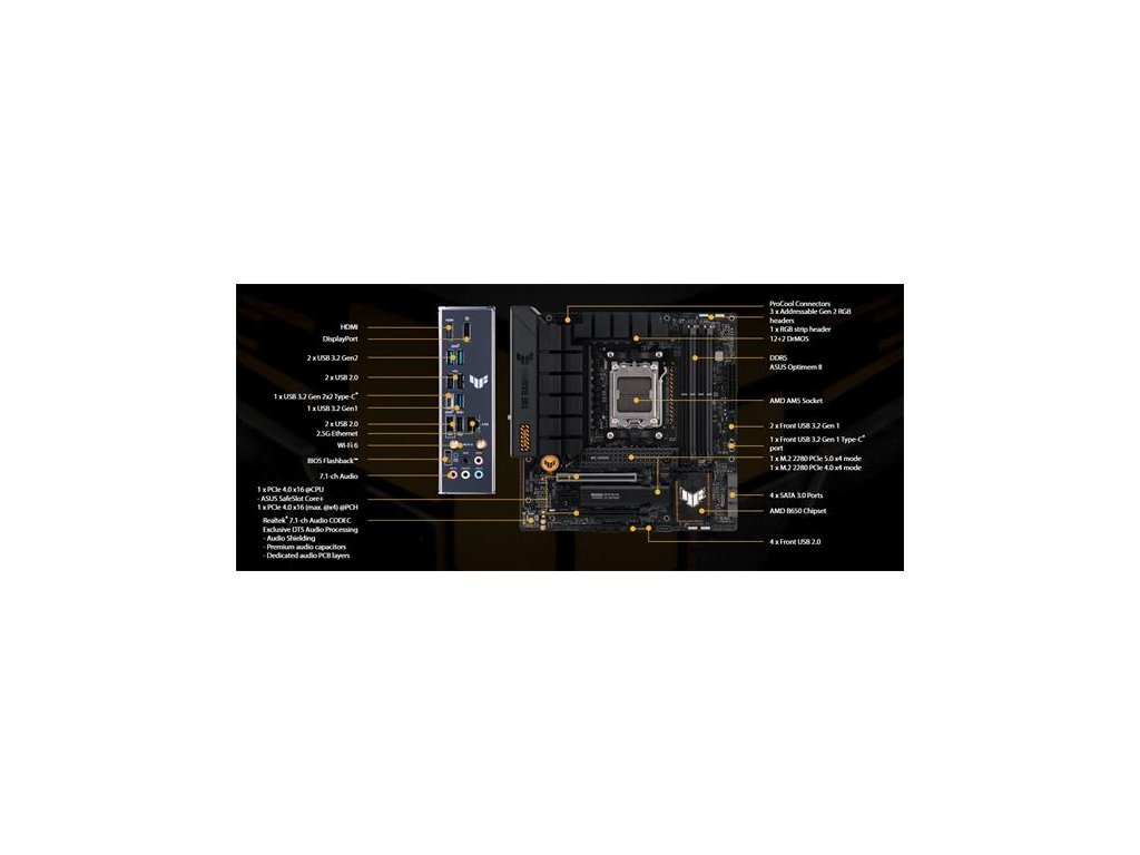 ASUS TUF GAMING B650M-PLUS WIFI preberá všetky základné prvky najnovších procesorov AMD Ryzen série 7000 a kombinuje ich s funkciami pripravenými na hru a overenou odolnosťou.Táto základná doska, navrhnutá s komponentmi vojenskej kvality, vylepšeným riešením napájania a komplexným chladiacim systémom, presahuje očakávania so skalopevným a stabilným výkonom pre maratónske hranie.