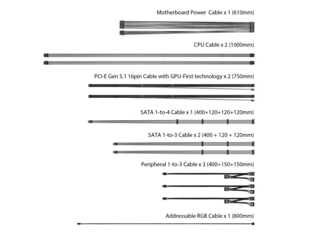 | Konektory: | 8pin CPU 1x, 8pin CPU 2x, PCIe 6-pin, PCIe 8-pin, PCIe 16-pin Gen5, SATA 15-pin, Molex |