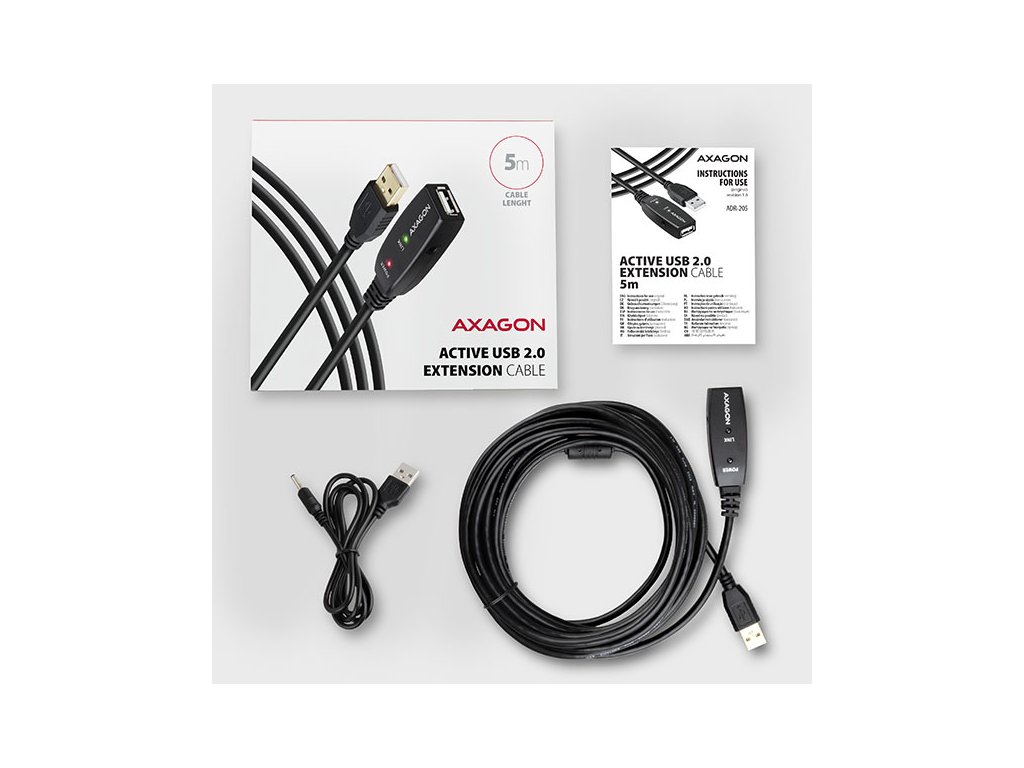 Aktivní prodlužovací USB 2.0 kabel AXAGON ADR-205 délky 5 metrů je ideální k propojení Vašeho počítače s USB zařízením jako je myš, klávesnice, webkamera, tiskárna, skener, plotr a dalšími. Aktivní USB repeater kabel zesiluje průchozí signál a umožnuje připojit USB zařízení na výrazně větší vzdálenost, než Vám umožní pasivní kabel. Dosah kabelu je možné dále prodloužit použitím několika kabelů za sebou. Velkou výhodou kabelu ADR-205 je integrovaný konektor přídavného napájení. Ve většině případů postačí napájení po USB sběrnici, avšak u zařízení s větším odběrem může být při větších vzdálenostech USB napájení nedostatečné a přídavné napájení ze sítě může v těchto případech problém vyřešit. Výjimečně kompaktní tělo repeater kabelu dovoluje bezproblémové použití v elektromontážních lištách nebo kabelových systémech. Použití kvalitního stíněného kabelu zaručuje vysokou rychlost komunikace a minimální nežádoucí interference. Vstup: • USB 2.0 pro připojení k počítači • konektor USB typu A (M) male (samec) Výstup: • USB 2.0 pro připojení vzdáleného USB zařízení • konektor USB typu A (F) female (samice) • Přenosová rychlost 480 / 12 / 1.5 Mbit/s (high / full / low speed) Napájení: • Napájení kabelu i připojených zařízení po USB sběrnici (bus-power mód 5V - 500mA). • Pro většinu připojených USB zařízení je napájení po USB sběrnici dostatečné a není potřeba žádné přídavné napájení. • Aktivní část kabelu obsahuje konektor (O 3.5 x 1.3mm vnější x vnitřní průměr) pro přídavné externí napájení 5V/1-2A. • Napájecí kabel USB A-M / 3.5mm jack délky 1.2 m je součástí balení. Kabel umožní napájení z běžné nabíječky mobilních telefonů s USB-A výstupem 5V / min. 1A, např. AXAGON ACU-DS16. • Při napájení repeater kabelu napájecím adaptérem lze připojit i externí 2.5'' disk bez potřeby vlastního napájení disku. • U delší USB trasy s několika repeater kabely zapojenými za sebou může být již napájení po USB sběrnici nedostatečné i pro USB zařízení s nižším odběrem než externí 2.5'' disk. Také v tomto případě může pomoci posílení napájení připojením napájecího adaptéru. Další vlastnosti: • Plně kompatibilní s USB 2.0 a zpětně kompatibilní s USB 1.1. • Plná podpora Plug and Play a Hot Plug. • Dvě LED indikující připojení k napájení a připojení USB zařízení. • Za aktivním USB kabelem může být použit i běžný pasivní USB kabel. • Rozměry aktivní části jsou 74 x 22 x 13 mm, kabel délky 5 m. • Váha 170 g. Podporované operační systémy: • MS Windows XP / Vista / 7 / 8 / 8.1 / 10 / 11 a novější, Windows Server 2003 / 2008 / 2012 / 2016 / 2019 / 2022 a novější (podporovány všechny 32- i 64-bitové verze OS Windows), Mac OS X 10.x a vyšší, Linux s jádrem 2.6.x a vyšším. • Pozn.: Ovladače jsou součástí podporovaných operačních systémů a nainstalují se zcela automaticky. Žádné jiné ovladače není třeba instalovat a nejsou ani k dispozici. Balení v kartonové krabičce obsahuje: • USB 2.0 A-M > A-F aktivní kabel délky 5 m, • USB-A / 3.5 mm napájecí kabel, • vícejazyčný návod CZ/DE/DK/ENG/ESP/FIN/FR/GR/HR/HU/IT/NL/PL/PT/RO/RU/SK/SWE/BG/CN/TR/ARA.Dodatočné parametre