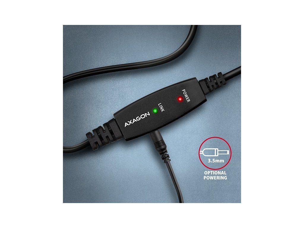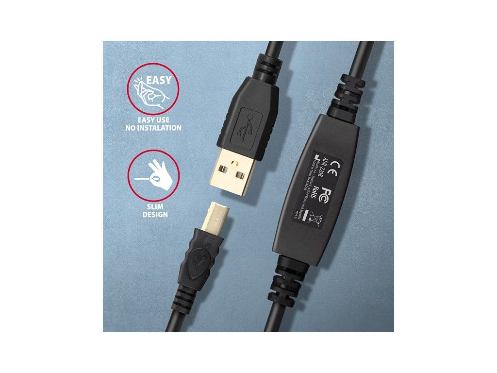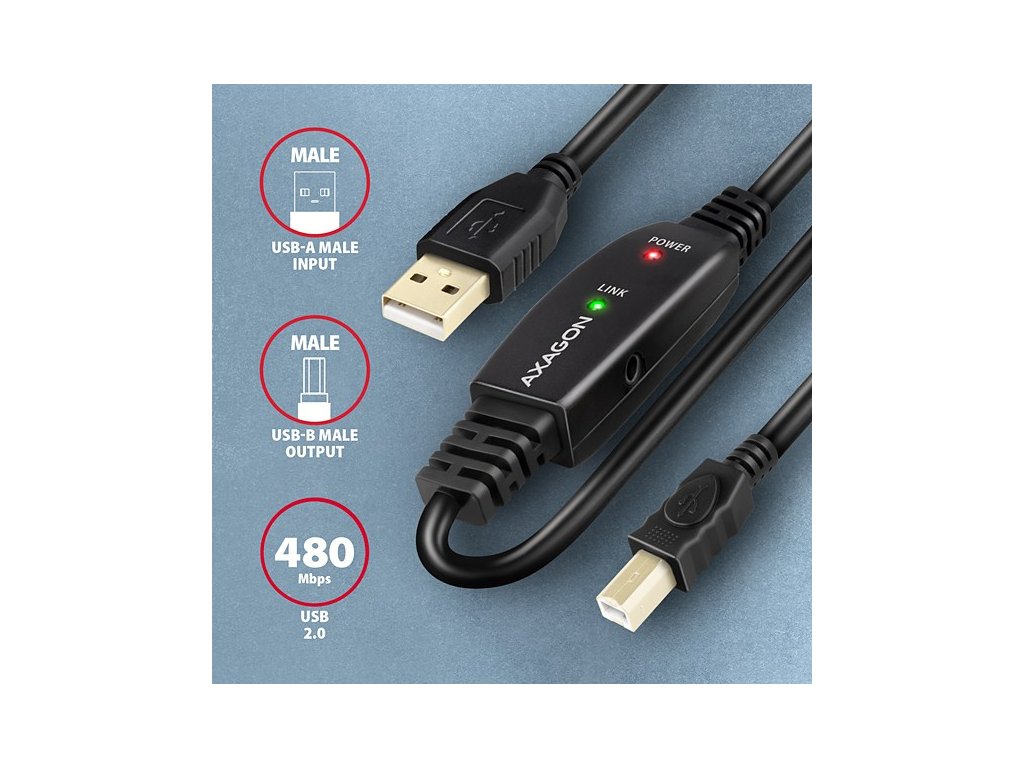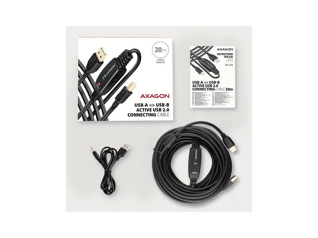 Aktivním propojovacím USB 2.0 kabelem AXAGON ADR-220B délky 20 metrů budete moci připojit např. tiskárnu, skener, plotr nebo další USB-B zařízení k Vašemu počítači. Aktivní USB repeater kabel zesiluje průchozí signál a umožnuje připojit USB-B zařízení na výrazně větší vzdálenost, než Vám umožní pasivní kabel. Dosah kabelu je možné dále prodloužit např. použitím prodlužovacího USB kabelu AXAGON ADR-210. Velkou výhodou kabelu ADR-220B je integrovaný konektor přídavného napájení. Ve většině případů postačí napájení po USB sběrnici, avšak u zařízení s větším odběrem může být při větších vzdálenostech USB napájení nedostatečné a přídavné napájení ze sítě může v těchto případech problém vyřešit. Výjimečně kompaktní tělo repeater kabelu dovoluje bezproblémové použití v elektromontážních lištách nebo kabelových systémech. Použití kvalitního stíněného kabelu zaručuje vysokou rychlost komunikace a minimální nežádoucí interference. Vstup: • USB 2.0 pro připojení k počítači • konektor USB typu A (M) male (samec) Výstup: • USB 2.0 pro připojení vzdáleného USB zařízení • konektor USB typu B (M) male (samec) • Přenosová rychlost 480 / 12 / 1.5 Mbit/s (high / full / low speed) Napájení: • Napájení kabelu i připojených zařízení po USB sběrnici (bus-power mód 5V - 500mA). • Pro většinu připojených USB zařízení je napájení po USB sběrnici dostatečné a není potřeba žádné přídavné napájení. • Aktivní část kabelu obsahuje konektor (O 3.5 x 1.3mm vnější x vnitřní průměr) pro přídavné externí napájení 5V/1-2A. • Napájecí kabel USB A-M / 3.5mm jack délky 1.2 m je součástí balení. Kabel umožní napájení z běžné nabíječky mobilních telefonů s USB-A výstupem 5V / min. 1A, např. AXAGON ACU-DS16. Další vlastnosti: • Plně kompatibilní s USB 2.0 a zpětně kompatibilní s USB 1.1. • Plná podpora Plug and Play a Hot Plug. • Dvě LED indikující připojení k napájení a připojení USB zařízení. • Za aktivním USB kabelem může být použit i běžný pasivní USB kabel. • Rozměry aktivní části jsou 95 x 22 x 13 mm, kabel délky 20 m. • Váha 674 g. Podporované operační systémy: • MS Windows XP / Vista / 7 / 8 / 8.1 / 10 / 11 a novější, Windows Server 2003 / 2008 / 2012 / 2016 / 2019 a novější (podporovány všechny 32- i 64-bitové verze OS Windows), Mac OS X 10.x a vyšší, Linux s jádrem 2.6.x a vyšším. • Pozn.: Ovladače jsou součástí podporovaných operačních systémů a nainstalují se zcela automaticky. Žádné jiné ovladače není třeba instalovat a nejsou ani k dispozici. Balení v kartonové krabičce obsahuje: • USB 2.0 A-M > B-M aktivní kabel délky 20 m, • USB-A / 3.5 mm napájecí kabel, • vícejazyčný návod CZ/DE/DK/ENG/ESP/FIN/FR/GR/HR/HU/IT/NL/PL/PT/RO/RU/SK/SWE/BG/CN/TR/ARA.Dodatočné parametre