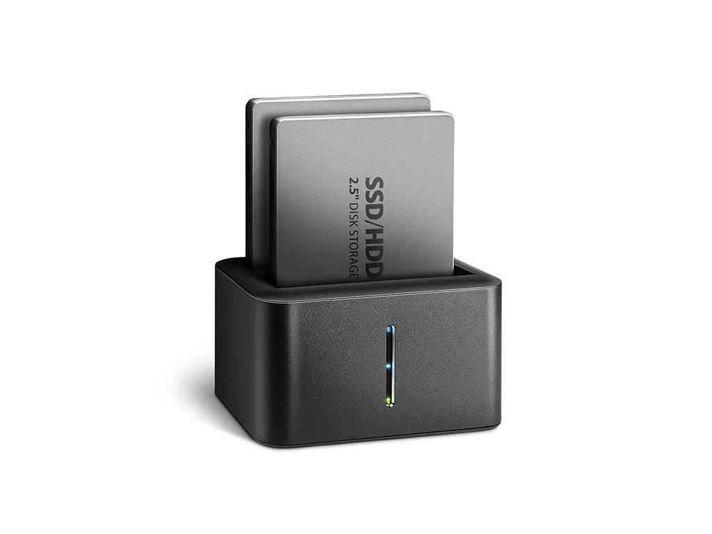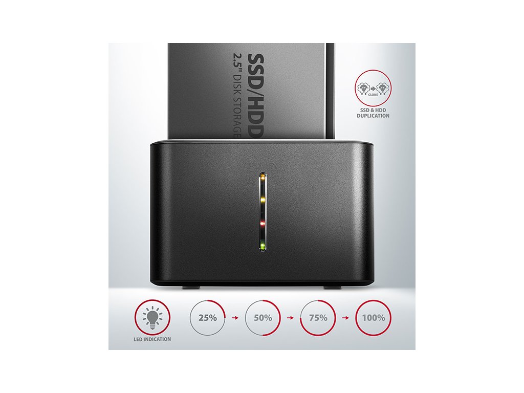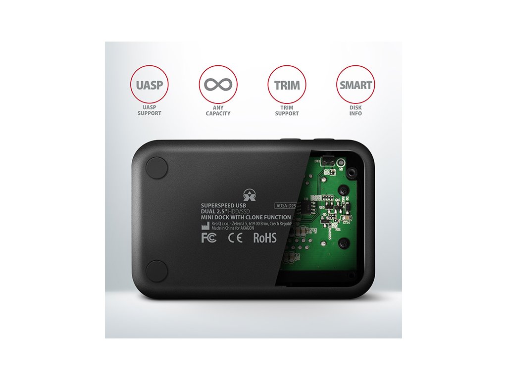 SuperSpeed USB 5 Gbps dokovací / klonovací stanice AXAGON ADSA-D25 CLONE MINI připojí k počítači snadno a rychle až dva 2.5'' disky současně. Připojení k počítači umožňuje USB Micro-B konektor na doku spolu s dodávaným kabelem USB Micro-B <-> USB-A. Tento kompaktní pomocník vám tak umožní nejjednodušší připojení libovolných 2.5'' SATA disků k počítači nebo notebooku. Jeden nebo i dva disky současně jen stačí zasunout do základny, nejsou potřeba žádné nástroje ani doplňky. Výměna disků je tak velmi rychlá a jednoduchá. Dokovací stanici také využijete pro snadné klonování obsahu připojených disků bez potřeby připojení k PC. Do prvního slotu stanice HDD A (source) zasunete zdrojový disk a do druhého slotu HDD B (target) zasunete cílový. Pak jen zmáčknete klonovací tlačítko a sledujete průběh klonování na stupnici čtyř LED diod. Po zkopírování všech dat je na cílovém disku přesná kopie původního disku. Dock tak lze využít jako autonomní zařízení pro pohodlné duplikování a vytváření obrazů disků. Jedná se o nejjednodušší způsob, jak přenést obsah například starého HDD disku na nový SSD disk, a to včetně funkčního operačního systému (Windows, macOS, Linux …). Rozhraní SATA 6G s podporou UASP dovolí užívat si rychlost moderních SSD disků. Podpora funkce TRIM pro omezení pozvolné degradace výkonu SSD v čase. Stanice umožňuje čtení S.M.A.R.T. informací monitorujících kondici SSD / HDD. Podporuje usínání připojených disků i stanice. Skříň stanice je dostatečně robustní a odolná, což umožňuje dokonalou stabilitu i s vloženými disky. Gumové nožky omezují posouvání po stole a vibrace pevných disků. Vnější plášť je proveden z hliníku s elegantním broušeným povrchem. Vstup: • USB 3.2 Gen 1 (USB 3.1 Gen 1 / USB 3.0) SuperSpeed USB 5 Gbps. • Rychlost až 5 Gbit/s. • Připojení přes USB Micro-B female konektor. Podpora zařízení: • Rozhraní SATA III - 6 Gb/s (600 MB/s). • Podpora 2.5'' SSD/HDD. • Max. kapacita disku - všechny bez omezení. • Max. výška 2.5'' disku - všechny bez omezení. Vlastnosti: • Kompatibilní s USB 3.2 Gen 2 (USB 3.1 Gen 2), USB 3.2 Gen 1 (USB 3.1 Gen 1 / USB 3.0), zpětně kompatibilní s USB 2.0. • Podpora přenosových rychlostí 5000 / 480 Mbit/s (SuperSpeed / HighSpeed). • Vyhovuje Serial ATA 3.0 specifikaci (SATA/600), přenosové rychlosti až 6 Gb/s (600 MB/s). • Vyhovuje Serial ATA 2.0 specifikaci (SATA/300), přenosové rychlosti až 3 Gb/s (300 MB/s). • Vyhovuje Serial ATA 1.0 specifikaci (SATA/150), přenosové rychlosti až 1.5 Gb/s (150 MB/s). • Vyhovuje USB Mass Storage Class specifikaci. • Celková propustnost / přenosová rychlost stanice je dána použitým USB rozhraním (teor. 5 Gbit/s). • BOT (Bulk-Only Transport). • Podpora UASP (USB Attached SCSI Protocol) pro rychlejší přenos dat ve Windows 8 a novějších. • Podpora funkce TRIM pro omezení pozvolné degradace výkonu SSD v čase. • Podpora S.M.A.R.T. (Self-Monitoring, Analysis, and Reporting Technology) systém monitorující stav disku. • Podpora bootování z SSD/HDD v dokovací stanici. • Možnost připojení zařízení za chodu díky podpoře Hot Plug. • Plná podpora Plug and Play. • HDD Auto Spin down - vypínání disků při nečinnosti. • HDD Turn Off - vypnutí disku po odebrání zařízení nebo uspání PC. • Připojení přes USB 3.2 Gen 1 Micro-B female konektor. • Kabel USB Micro-B <-> USB-A délky 60 cm je součástí balení. • LED indikující napájení SSD/HDD docku a aktivitu disků v obou šachtách. • Rozměry stanice 89 x 58 x 59 mm. • Hmotnost 137 g. Napájení: • Napájecí kabel USB-A <-> 3.5/1.3 mm DC 5V délky 1 m je součástí balení. Kabel umožní napájení stanice z USB-A portu počítače nebo běžné nabíječky mobilních telefonů s USB-A výstupem 5V / min. 1A, např. AXAGON ACU-DS16. • Vypínač napájení. Funkce klonování obsahu disku: • Klonování probíhá bez připojení stanice k počítači. • Cílový disk musí mít stejnou nebo větší kapacitu jako disk zdrojový, jinak nelze klonování spustit. • Klonovat lze jak pevné disky HDD, tak SSD. • Rychlost klonování SSD až 300 MB/s. • Celkový čas naklonování disku závisí na kapacitě zdrojového disku, ne na objemu dat na disku. Podporované operační systémy: • MS Windows 7 / 8 / 10 / 11 a novější, Windows Server 2008 / 2012 / 2016 / 2019 / 2022 a novější (podporovány všechny 32- i 64-bitové verze OS Windows), Mac OS X 10.x a vyšší, Linux s jádrem 2.6.x a vyšším. • Pozn.: Ovladače jsou součástí podporovaných operačních systémů a nainstalují se zcela automaticky. Žádné jiné ovladače není třeba instalovat a nejsou ani k dispozici. Balení v kartonové krabičce obsahuje: • SSD/HDD dock, • USB Micro-B <-> USB-A kabel délky 60 cm, • napájecí kabel 100 cm, • multijazyčný manuál CZ/DE/DK/ENG/ESP/FIN/FR/GR/HR/HU/IT/NL/PL/PT/RO/RU/SK/SWE/BG/CN/TR/ARA.Dodatočné parametre