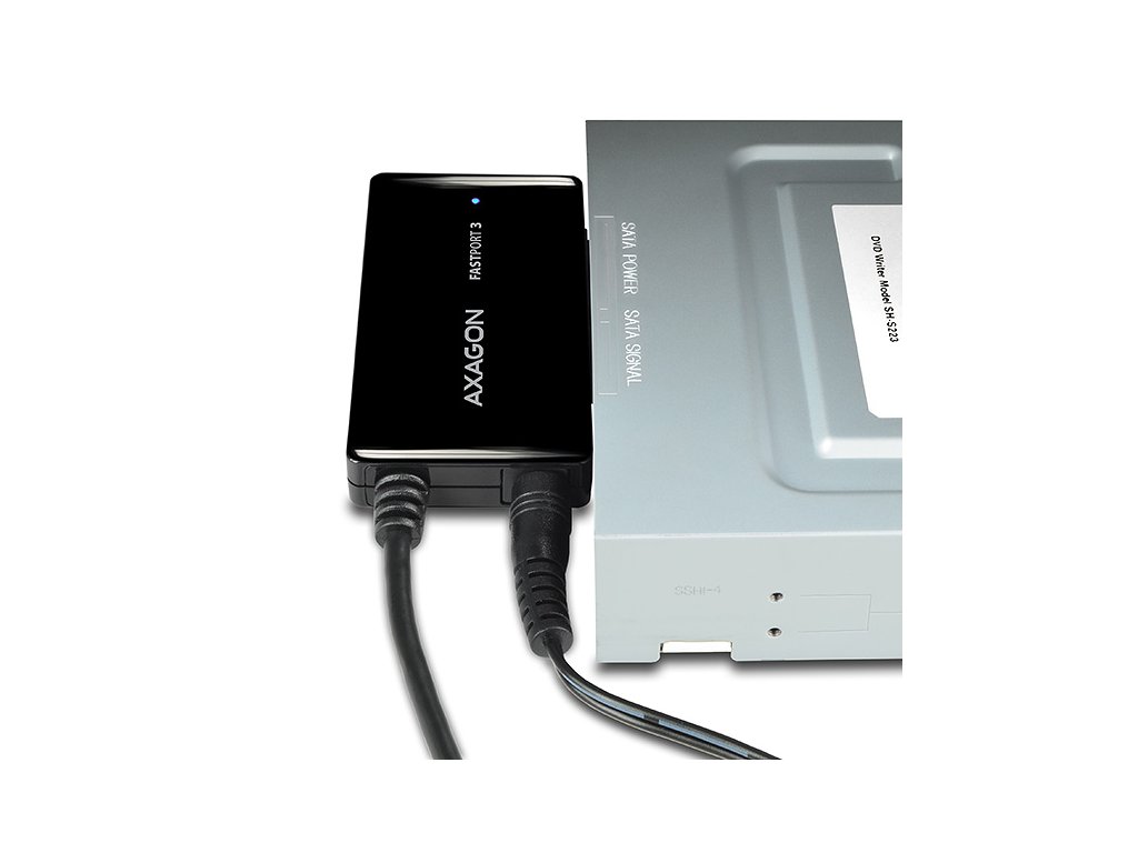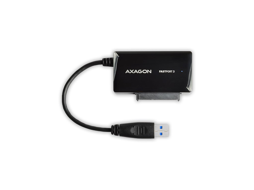 Univerzální all-in-one adaptér AXAGON ADSA-FP3 FASTport3 s USB 3.0 a SATA 6G rozhraním určený pro snadné připojení libovolného SATA disku nebo mechaniky. Podporuje všechny druhy 2.5'' HDD/SSD, 3.5'' pevných disků i 5.25'' optické mechaniky CD, DVD nebo Blu-ray. Poradí si se všemi SATA, SATA II i SATA III disky bez omezení maximální kapacity. Aktuální SATA III/6G rozhraní dovolí i využití rychlosti moderních SSD disků. Čtení S.M.A.R.T. informací monitorujících kondici připojených disků. Podpora uspávání připojených disků i adaptéru. Instalaci zvládne i úplný laik - disk se připojí k adaptéru a adaptér do USB portu počítače, zbytek proběhne automaticky. Adaptér s 2.5'' HDD/SSD stačí napájet po USB sběrnici, odpadá manipulace se síťovým napáječem. Vlastnosti: • Kompatibilní s USB 3.0, zpětně kompatibilní s USB 2.0. • Podpora přenosových rychlostí 12 / 480 / 5000 Mbit/s (full / high / super speed). • Podpora 2.5'' SATA III/II/I disků bez omezení maximální kapacity. • Vyhovuje Serial ATA 3.1 specifikaci (SATA/600), přenosové rychlosti až 6 Gb/s. • Vyhovuje Serial ATA 2.0 specifikaci (SATA/300), přenosové rychlosti až 3 Gb/s (300 MB/s). • Vyhovuje Serial ATA 1.0 specifikaci (SATA/150), přenosové rychlosti až 1.5 Gb/s (150 MB/s). • Celková propustnost / přenosová rychlost adaptéru je dána použitým USB 3.0 rozhraním (teor. 5 Gbit/s). • Podpora bootování z SSD/HDD připojeného přes USB adaptér. • Podpora HDD autostop - uspávání připojených disků při nečinnosti. • Možnost připojení zařízení za chodu díky podpoře Hot Plug. • Plná podpora plug and play. • Připojení přes přímý USB 3.0 type A male konektor na 12 cm dlouhém kabelu napevno spojeném s adaptérem. • Decentně svítící modrá LED dioda indikující připojení USB napájení (trvalým svitem) a přenos dat (blikáním). • Napájení po USB 3.0 sběrnici až 900mA z jednoho USB portu zcela dostačuje pro 2.5'' HDD/SSD. • Pro napájení adaptéru s 3.5'' diskem nebo optickou mechanikou je přibalen kompaktní externí AC/DC adapter 12V - 2A (24W) s přívodním kabelem délky cca. 150 cm. • Rozměry USB adaptéru 71 x 46 x 14.3 mm, hmotnost adaptéru pouze 39 g vč. USB kabelu. Podporované operační systémy: • MS Windows XP / Vista / 7 / 8 / 10 a novější, Windows Server 2003 / 2008 / 2012 a novější (podporovány všechny 32- i 64-bitové verze OS Windows), Mac OS X 10.x a vyšší, Linux s jádrem 2.6.x a vyšším. • Pozn.: Ovladače jsou součástí podporovaných operačních systémů a nainstalují se zcela automaticky. Žádné jiné ovladače není třeba instalovat a nejsou ani k dispozici. Balení v kartonové krabičce obsahuje • USB 3.0 - SATA 6G adaptér vč. USB 3.0 kabelu délky 12 cm a napájecí adapter 100-240V / 12V-2A.Dodatočné parametre