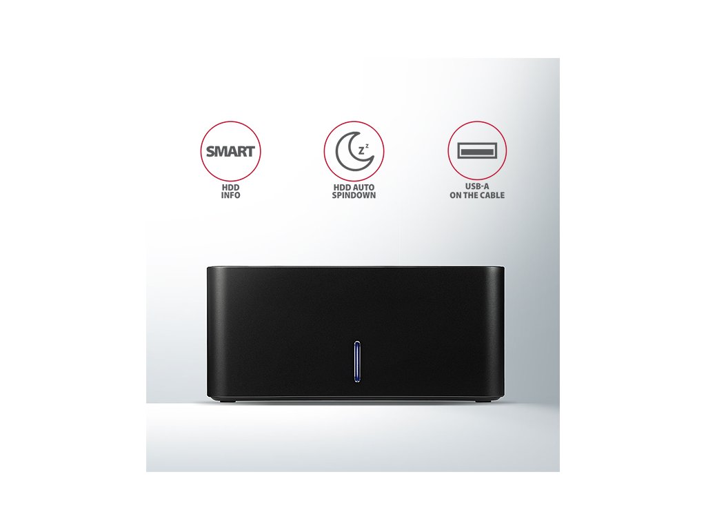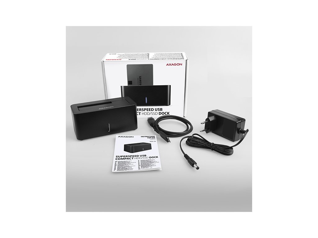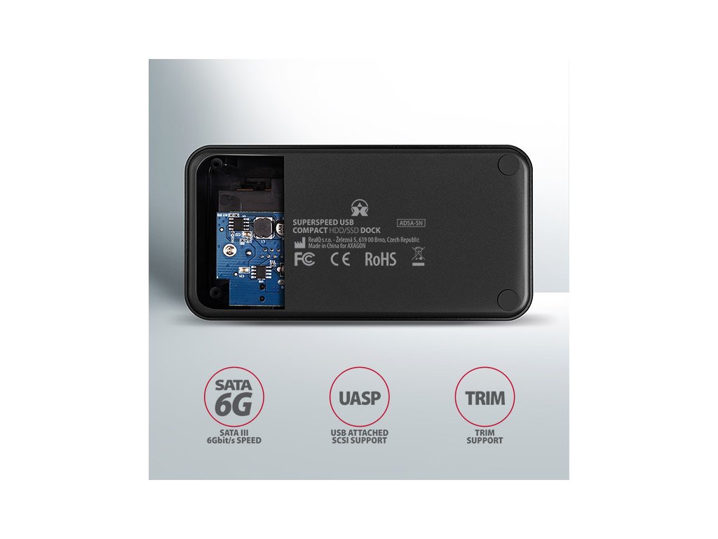 SuperSpeed USB dokovací stanice AXAGON ADSA-SN COMPACT HDD/SSD DOCK připojí k počítači snadno a rychle libovolný SATA disk. Šikovný pomocník pro nejjednodušší a nejrychlejší způsob připojení libovolných SATA disků k počítači - disk jen zasunete do základny. Automatickou instalaci stanice zvládne i úplný laik. Rozhraní SATA 6G s podporou UASP dovolí užívat si rychlost moderních SSD disků. Podpora funkce TRIM pro omezení pozvolné degradace výkonu SSD v čase. Čtení S.M.A.R.T. informací monitorujících kondici připojených disků. Podpora uspávání připojených disků i stanice. Nízko položené těžiště dokovací stanice pro dobrou stabilitu. Gumové nožky pro omezení vibrací. Moderní minimalistický design skříně s pláštěm z hliníku. Vstup: • USB 3.2 Gen 1 (USB 3.1 Gen 1 / USB 3.0) SuperSpeed USB s rychlostí až 5 Gbit/s. • Připojení přes micro USB type B female konektor. Podpora zařízení: • rozhraní SATA III - 6 Gb/s (600 MB/s), • podpora 2.5'' HDD/SSD, • podpora 3.5'' HDD, • max. kapacita disku - všechny bez omezení, • max. výška 2.5'' disku - všechny bez omezení. Další vlastnosti: • Kompatibilní s USB 3.2 Gen 1 / USB 3.1 Gen 1 / USB 3.0, zpětně kompatibilní s USB 2.0. • Podpora přenosových rychlostí 5000 / 480 Mbit/s (SuperSpeed / HighSpeed). • Vyhovuje Serial ATA 3.0 specifikaci (SATA/600), přenosové rychlosti až 6 Gb/s (600 MB/s). • Vyhovuje Serial ATA 2.0 specifikaci (SATA/300), přenosové rychlosti až 3 Gb/s (300 MB/s). • Vyhovuje Serial ATA 1.0 specifikaci (SATA/150), přenosové rychlosti až 1.5 Gb/s (150 MB/s). • Celková propustnost / přenosová rychlost boxu je dána použitým USB rozhraním (teor. 5 Gbit/s). • Podpora UASP (USB Attached SCSI Protocol) a BOT (Bulk-Only Transport). • Podpora bootování z SSD/HDD v dokovací stanici. • Možnost připojení zařízení za chodu díky podpoře Hot Plug. • Plná podpora Plug and Play. • HDD Auto Spindown - automatické uspání disku při nečinnosti trvající 15 minut. • HDD Turn Off - vypnutí disku po odebrání zařízení nebo uspání PC. • Kabel micro USB-B / USB-A délky 80 cm součástí balení. • Decentní modrá LED indikující připojení k USB portu počítače (trvalým svitem) a přenos dat (blikáním). • Vypínač napájení. • Napájení přes kompaktní externí AC/DC adapter 12V - 2A (24W) s přívodním kabelem délky 150 cm. • Rozměry stanice 130 x 65 x 59 mm. • Hmotnost 190 g. Podporované operační systémy: • MS Windows XP / Vista / 7 / 8 / 8.1 / 10 a novější, Windows Server 2003 / 2008 / 2012 / 2016 a novější (podporovány všechny 32- i 64-bitové verze OS Windows), Mac OS X 10.x a vyšší, Linux s jádrem 2.6.x a vyšším. Pozn.: Ovladače jsou součástí podporovaných operačních systémů a nainstalují se zcela automaticky. Žádné jiné ovladače není třeba instalovat a nejsou ani k dispozici. Balení v kartonové krabičce s přehledně uvedenými parametry: • USB 3.2 Gen 1 HDD dock, • micro USB-B - USB-A kabel délky 80 cm, • napájecí adapter 100-240V / 12V-2A, • multijazyčný manuál CZ/DE/DK/ENG/ESP/FIN/FR/GR/HR/HU/IT/NL/PL/PT/RO/RU/SK/SWE/BG/CN/TR/ARA.Dodatočné parametre
