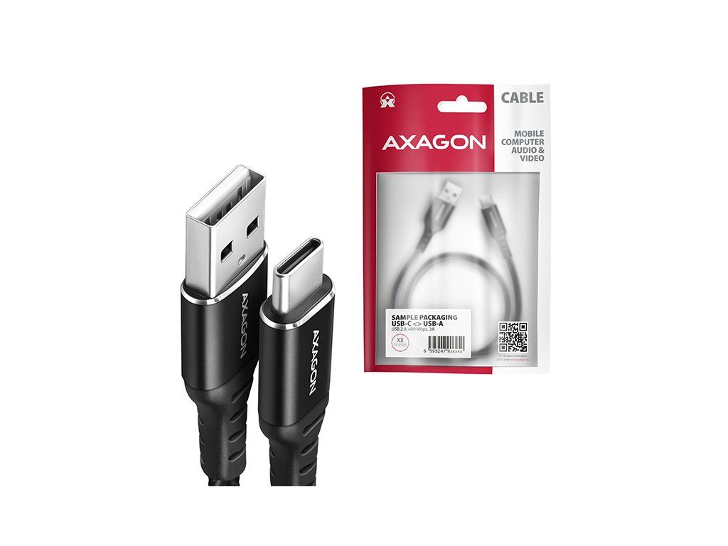 Prémiový propojovací USB-C <-> USB-A datový a nabíjecí AXAGON BUCM-AM10AB HQ USB 2.0 kabel s konektory USB-C male a USB-A male. Kabel je navržen pro synchronizaci dat a nabíjení telefonů, tabletů a dalších mobilních zařízení. Podporuje přenos dat rychlostí až 480 Mb/s a nabíjení proudem až 3A. Kabel je kompatibilní s nabíjecími technologiemi Quick Charge, Samsung AFC, Huawei FCP, SMART a dalšími. Odolný datový a napájecí kabel s prodlouženou životností je opatřen kovovými koncovkami, konektory s poniklovaným povrchem a pozlacenými kontakty. Vodiče kabelu jsou vyrobené z pocínované bezkyslíkaté mědi. Kvalitní izolace kabelu, vyrobená z flexibilního TPE, zaručuje maximální odolnost, ale zachovává i dostatečnou ohebnost. Konečnou pevnost kabelu dodává nylonový oplet. Bonusem je praktická páska pro snadné sbalení kabelu. Napájecí vodiče 22AWG (nižší číslo = větší průřez a nižší odpor vodiče) garantují rychlé nabíjení telefonů a dalších mobilních zařízení. Datové vodiče 30AWG spolu s kvalitním stíněním, zajišťují spolehlivý přenos dat. Dvojité stínění chrání přenášené signály před nepříznivým rušením. Nylonový oplet v kombinaci s kabelovou průchodkou podstatně zmírňují nebezpečný ohyb kabelu. Životnost kabelu je tak prodloužena na více jak 8000 standardních ohybů. Mechanickou odolnost kabelu zvyšují také hliníkové kryty koncovek. Konektory: • USB-C (M) male / samec • USB-A (M) male / samec Další vlastnosti: • DATA SYNC & FAST CHARGING - současný přenos dat a dobíjení baterie mobilního zařízení. • USB 2.0, kompatibilní s USB 1.1. • Podpora přenosových rychlostí 480 / 12 / 1.5 Mb/s (High / Full / Low speed). • Podpora rychlého nabíjení proudem až 3A. • Podporované technologie nabíjení: Qualcomm Quick Charge 2.0/3.0, Samsung Adaptive Fast Charging, Huawei Fast Charge Protocol, SMART Charging a další. • Kabel obsahuje napájecí vodiče 22AWG, datové vodiče 30AWG. • Vodiče z pocínované bezkyslíkaté mědi pro omezení oxidace, zvýšení vodivosti a čistý signál bez zkreslení. • Stínění pokovenou fólií a opletením z pocínované mědi minimalizuje rušení a zabraňuje ztrátě signálu. • Poniklované konektory a pozlacené kontakty zamezují oxidaci a zajišťují spolehlivé spojení. • Vhodný pro mobilní telefony a smartphony, tablety, powerbanky, fotoaparáty a další mobilní zařízení s USB-C konektorem. Další údaje: • délka kabelu 1 m, • vnější průměr kabelu 4 mm. Balení v zataveném fóliovém obalu s potiskem a s otvorem pro zavěšení obsahuje: • USB-C M <-> USB-A M kabel černé barvy, • stahovací páska.Dodatočné parametre