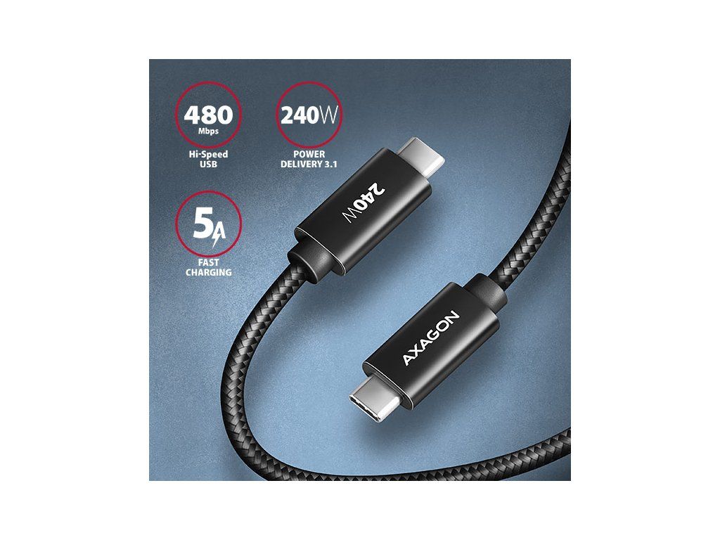 Prémiový propojovací USB-C <-> USB-C datový a nabíjecí AXAGON BUCM2-CM25AB CHARGE kabel s konektory USB-C male na obou koncích. Kabel je navržen zejména pro nabíjení a napájení počítačů, monitorů, notebooků, telefonů, tabletů a dalších zařízení. Podporuje také přenos dat rychlostí až 480 Mb/s. Kabel má implementovánu nejnovější specifikaci nabíjecí technologie Power Delivery 3.1. Tato technologie přináší mimo jiné výkon 240W což je více než dvojnásobek oproti Power delivery 3.0, která dosahuje výkonu 100W. Můžete tak využít nejen standardní rozsah výkonu (Standard Power Range - SPR) pro napětí 5, 9, 15 a 20V s proudem 5A, ale i dostatečný výkon v pevných napětí 28, 36 a 48V s maximálním proudem 5A (Extended Power Range - EPR). Kabel díky nové technologii PD 3.1 můžete využít i pro napájení zařízení s mnohem větším výkonem jako jsou herní notebooky, 4K monitory, elektrické nářadí nebo stále oblíbenější e-koloběžky. Pro identifikaci kabelu a jeho proudových schopností má kabel integrován E-Mark čip. Kabel je také kompatibilní s nabíjecími technologiemi Quick Charge, PPS, Samsung AFC a SFC, Apple, SMART a dalšími. Odolný obousměrný kabel s prodlouženou životností je opatřen kovovými koncovkami, konektory s poniklovaným povrchem a pozlacenými kontakty. Vodiče kabelu jsou vyrobené z pocínované bezkyslíkaté mědi. Kvalitní izolace kabelu, vyrobená z flexibilního TPE, zaručuje maximální odolnost, ale zachovává i dostatečnou ohebnost. Konečnou pevnost kabelu dodává nylonový oplet. Bonusem je praktická páska pro snadné sbalení kabelu. Napájecí vodiče 22AWG (nižší číslo = větší průřez a nižší odpor vodiče) garantují rychlé nabíjení telefonů a dalších mobilních zařízení. Datové vodiče 30AWG spolu s kvalitním stíněním, zajišťují spolehlivý přenos dat. Dvojité stínění chrání přenášené signály před nepříznivým rušením. Nylonový oplet v kombinaci s kabelovou průchodkou podstatně zmírňují nebezpečný ohyb kabelu. Životnost kabelu je tak prodloužena na více jak 8000 standardních ohybů. Mechanickou odolnost kabelu zvyšují také hliníkové kryty koncovek. Konektory: • 2x USB-C (M) male / samec. Další vlastnosti: • DATA SYNC & FAST CHARGING - současný přenos dat a nabíjení připojeného zařízení. • USB 480Mbps (USB 2.0), kompatibilní s USB 1.1. • Podpora přenosových rychlostí 480 / 12 / 1.5 Mb/s. • Podporované technologie nabíjení: Power Delivery 2.0/3.0/3.1 - 240W (48V/5A), Qualcomm Quick Charge 2.0 / 3.0 / 4+, PPS, Samsung Adaptive Fast Charging a Super Fast Charging, Huawei Fast Charge Protocol, Apple Fast Charging, SMART Charging a další. • Podpora specifikace Extended Power Range (EPR) do 240W a specifikace Standard Power Range (SPR) do 100W. • Podpora rychlého nabíjení proudem až 5A. • Integrovaný E-MARK čip. • Kabel obsahuje napájecí vodiče 22AWG, datové vodiče 30AWG. • Vodiče z pocínované bezkyslíkaté mědi pro omezení oxidace, zvýšení vodivosti a čistý signál bez zkreslení. • Stínění pokovenou fólií a opletením z pocínované mědi minimalizuje rušení a zabraňuje ztrátě signálu. • Poniklované konektory a pozlacené kontakty zamezují oxidaci a zajišťují spolehlivé spojení. • Vhodný pro počítače, notebooky, mobilní telefony, tablety, powerbanky, elektrické nářadí a další zařízení s USB-C konektorem. Další údaje: • délka kabelu 2.5 m, • vnější průměr kabelu 4.6 mm. Balení v zataveném fóliovém obalu s potiskem a s otvorem pro zavěšení obsahuje: • USB-C M <-> USB-C M kabel černé barvy, • stahovací páska.Dodatočné parametre