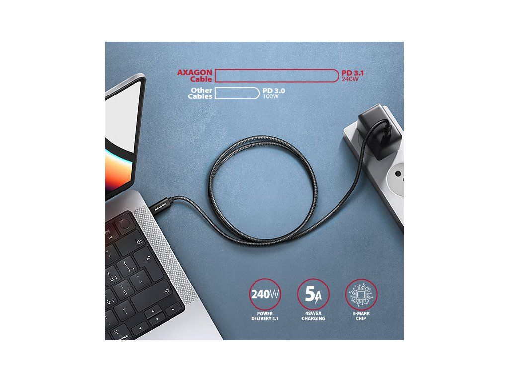 Prémiový propojovací USB-C <-> USB-C datový a nabíjecí AXAGON BUCM2-CM30AB CHARGE kabel s konektory USB-C male na obou koncích. Kabel je navržen zejména pro nabíjení a napájení počítačů, monitorů, notebooků, telefonů, tabletů a dalších zařízení. Podporuje také přenos dat rychlostí až 480 Mb/s. Kabel má implementovánu nejnovější specifikaci nabíjecí technologie Power Delivery 3.1. Tato technologie přináší mimo jiné výkon 240W což je více než dvojnásobek oproti Power delivery 3.0, která dosahuje výkonu 100W. Můžete tak využít nejen standardní rozsah výkonu (Standard Power Range - SPR) pro napětí 5, 9, 15 a 20V s proudem 5A, ale i dostatečný výkon v pevných napětí 28, 36 a 48V s maximálním proudem 5A (Extended Power Range - EPR). Kabel díky nové technologii PD 3.1 můžete využít i pro napájení zařízení s mnohem větším výkonem jako jsou herní notebooky, 4K monitory, elektrické nářadí nebo stále oblíbenější e-koloběžky. Pro identifikaci kabelu a jeho proudových schopností má kabel integrován E-Mark čip. Kabel je také kompatibilní s nabíjecími technologiemi Quick Charge, PPS, Samsung AFC a SFC, Apple, SMART a dalšími. Odolný obousměrný kabel s prodlouženou životností je opatřen kovovými koncovkami, konektory s poniklovaným povrchem a pozlacenými kontakty. Vodiče kabelu jsou vyrobené z pocínované bezkyslíkaté mědi. Kvalitní izolace kabelu, vyrobená z flexibilního TPE, zaručuje maximální odolnost, ale zachovává i dostatečnou ohebnost. Konečnou pevnost kabelu dodává nylonový oplet. Bonusem je praktická páska pro snadné sbalení kabelu. Napájecí vodiče 22AWG (nižší číslo = větší průřez a nižší odpor vodiče) garantují rychlé nabíjení telefonů a dalších mobilních zařízení. Datové vodiče 30AWG spolu s kvalitním stíněním, zajišťují spolehlivý přenos dat. Dvojité stínění chrání přenášené signály před nepříznivým rušením. Nylonový oplet v kombinaci s kabelovou průchodkou podstatně zmírňují nebezpečný ohyb kabelu. Životnost kabelu je tak prodloužena na více jak 8000 standardních ohybů. Mechanickou odolnost kabelu zvyšují také hliníkové kryty koncovek. Konektory: • 2x USB-C (M) male / samec. Další vlastnosti: • DATA SYNC & FAST CHARGING - současný přenos dat a nabíjení připojeného zařízení. • USB 480Mbps (USB 2.0), kompatibilní s USB 1.1. • Podpora přenosových rychlostí 480 / 12 / 1.5 Mb/s. • Podporované technologie nabíjení: Power Delivery 2.0/3.0/3.1 - 240W (48V/5A), Qualcomm Quick Charge 2.0 / 3.0 / 4+, PPS, Samsung Adaptive Fast Charging a Super Fast Charging, Huawei Fast Charge Protocol, Apple Fast Charging, SMART Charging a další. • Podpora specifikace Extended Power Range (EPR) do 240W a specifikace Standard Power Range (SPR) do 100W. • Podpora rychlého nabíjení proudem až 5A. • Integrovaný E-MARK čip. • Kabel obsahuje napájecí vodiče 22AWG, datové vodiče 30AWG. • Vodiče z pocínované bezkyslíkaté mědi pro omezení oxidace, zvýšení vodivosti a čistý signál bez zkreslení. • Stínění pokovenou fólií a opletením z pocínované mědi minimalizuje rušení a zabraňuje ztrátě signálu. • Poniklované konektory a pozlacené kontakty zamezují oxidaci a zajišťují spolehlivé spojení. • Vhodný pro počítače, notebooky, mobilní telefony, tablety, powerbanky, elektrické nářadí a další zařízení s USB-C konektorem. Další údaje: • délka kabelu 3 m, • vnější průměr kabelu 4.6 mm. Balení v zataveném fóliovém obalu s potiskem a s otvorem pro zavěšení obsahuje: • USB-C M <-> USB-C M kabel černé barvy, • stahovací páska.Dodatočné parametre