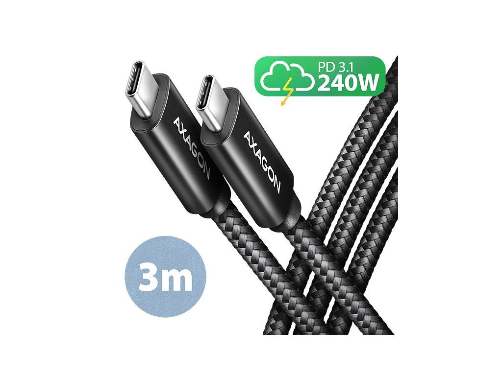 AXAGON BUCM2-CM30AB, CHARGE kábel USB-C <-> USB-C, 3m, Hi-Speed USB, PD 240W 5A, ALU, oplet, čierny BUCM2-CM30AB