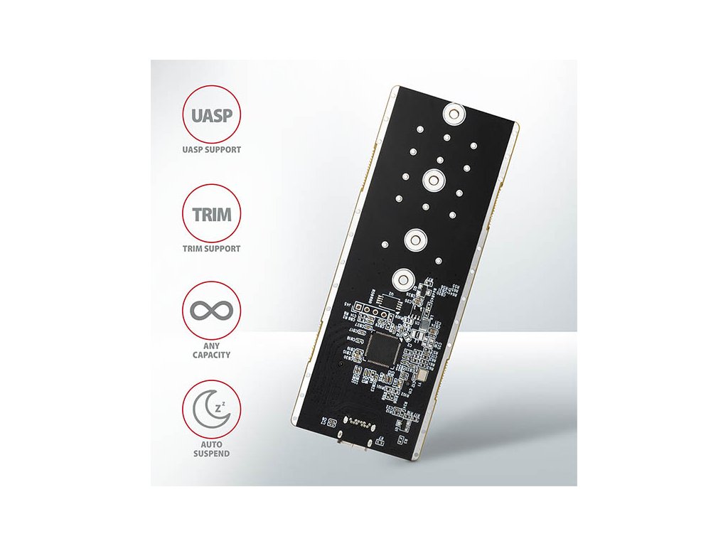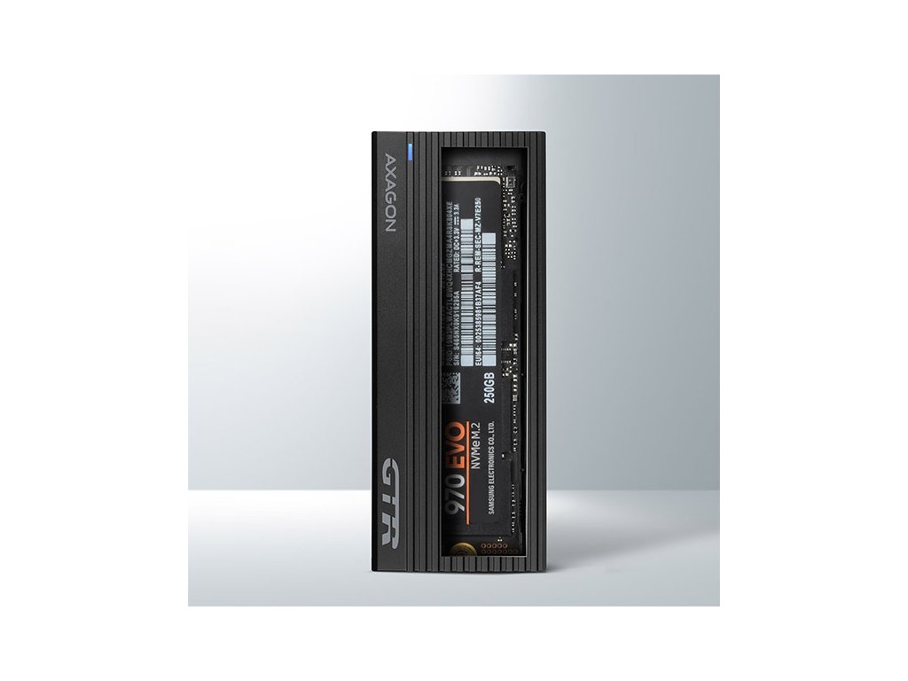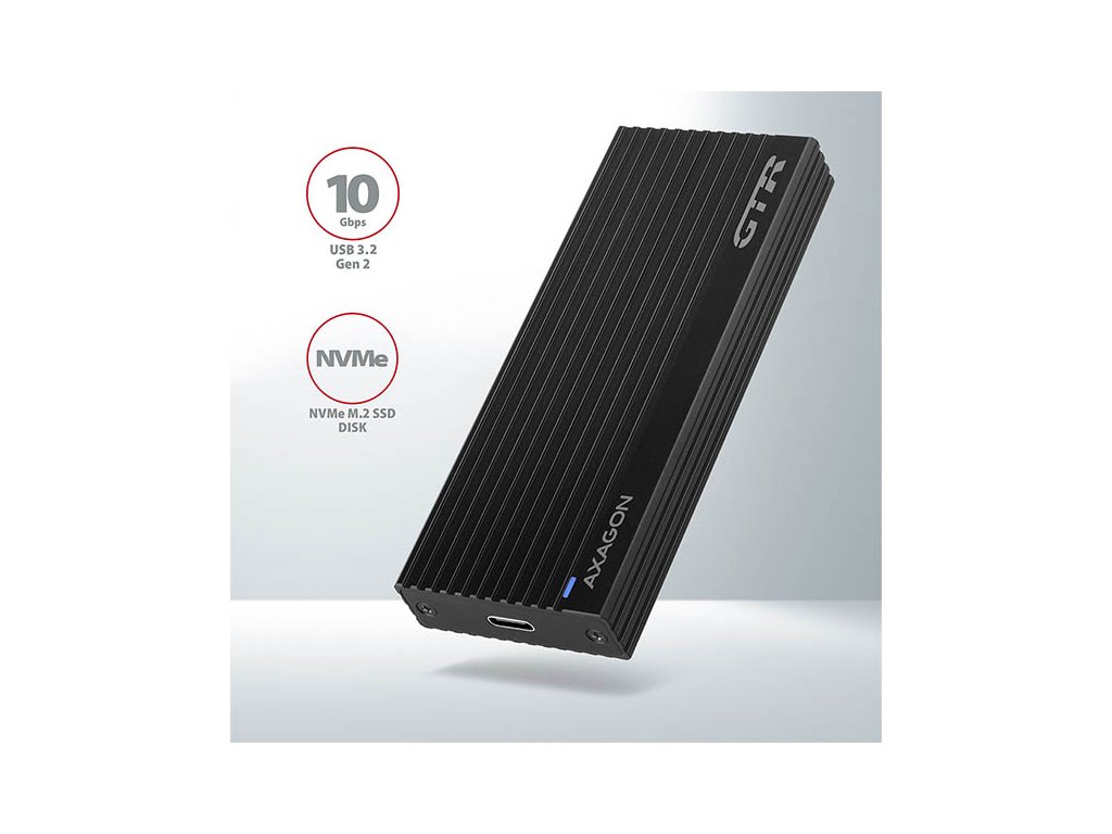 Super rychlý externí AXAGON EEM2-GTR THIN RIB box s USB 3.2 Gen 2 rozhraním je určen pro NVMe (PCI-Express) M.2 SSD disky. Spolehlivé připojení k počítači umožňuje oboustranný USB-C konektor na boxu spolu s dodávaným kabelem USB-C -> USB-C. Žebrovaný design těla boxu a teplovodivé podložky zajistí velice dobré chlazení vloženého M.2 SSD disku. Prodlužuje se tak jeho životnost a také je zamezeno zpomalování rychlosti disku tzv. „Thermal Throttling“. Robustní tělo boxu také zajistí dodatečnou ochranu disku. SuperSpeed USB 10 Gbit/s rozhraní dovolí užívat si rychlost moderních M.2 SSD disků. Díky rychlému USB 3.2 Gen 2 rozhraní je přenosová rychlost až 10Gb/s. Do externího boxu je možné použít NVMe M.2 SSD disky až do rozměru 22x80 mm. Box nemá omezení kapacity SSD disků. Karty M.2 mohou být jednostranné nebo oboustranné. Vložením M.2 SSD disku do tohoto boxu snadno vytvoříte rychlý a kompaktní externí disk. Box je možné použít jak s počítači a notebooky, tak s mobilními telefony a tablety. Vstup: • USB 3.2 Gen 2 / SuperSpeed+ USB s rychlostí až 10 Gbit/s. • Připojení přes reverzibilní USB type C female konektor. Podpora zařízení: • NVMe (PCI-Express) M.2 SSD disky, • určeno pro karty formátu M-key nebo B+M key, • NGFF 75-pinový M-key slot pro NVMe M.2 disky. Další vlastnosti: • Kompatibilní s USB 3.2 Gen 2, zpětně kompatibilní s USB 3.1 Gen 1 / USB 3.0 a USB 2.0. • Podpora přenosových rychlostí 10.000 / 5000 / 480 Mbit/s (SuperSpeed+ / SuperSpeed / HighSpeed). • Podpora M key nebo B+M key NVMe (PCI-Express) M.2 SSD disků bez omezení maximální kapacity. • Podpora M.2 disků rozměrů - 2230, 2242, 2260, 2280 mm. • Podpora jednostranných i oboustranných M.2 SSD disků. • Vyhovuje PCI Express Base Specification Revision 3.1a specifikaci. • Vyhovuje NVM Express 1.3 specifikaci. • Vyhovuje USB Mass Storage Class specifikaci. • Celková propustnost / přenosová rychlost boxu je dána použitým USB 3.2 Gen 2 rozhraním (teoreticky až 10 Gbit/s). • Reálná propustnost / přenosová rychlost boxu kolem 1000 MB/s (1 GB/s) je dána limity USB 3.2 Gen 2 rozhraní. • Podpora UASP (USB Attached SCSI) pro rychlejší přenos dat ve Windows 8 a novějších. • Podpora funkce TRIM pro omezení pozvolné degradace výkonu SSD v čase. • Podpora bootování z SSD v externím boxu. • Možnost připojení zařízení za chodu díky podpoře Hot Plug. • Plná podpora Plug and Play. • Podpora úsporného režimu - usínání disku po 5 minutách nečinnosti. • Napájení po USB sběrnici až 900mA z jednoho USB portu zcela dostačuje ve všech případech. • Modrá LED dioda indikující připojení k USB portu počítače (trvalým svitem) a přenos dat (blikáním). • Hliníkové žebrované tělo a teplovodivé podložky napomáhají lepšímu chlazení M.2 SSD disku. • Vyšší povrchová teplota boxu není závadou - díky hliníkovému tělu je teplo generované provozem disku lépe odváděno a předáváno do okolí. • Připojení přes USB 3.2 Gen 2 type C female konektor. • Kabel USB type C male / USB type C male délky 20 cm je součástí balení. Další údaje: • Rozměry externího boxu 106 x 43 x 14 mm. • Hmotnost externího boxu 68 g (bez USB kabelu a M.2 SSD disku). Podporované operační systémy: • MS Windows 7 / 8 / 8.1 / 10 a novější, Windows Server 2008 / 2012 / 2016 a novější (podporovány všechny 32- i 64-bitové verze OS Windows), Mac OS X 10.x a vyšší, Linux s jádrem 2.6.x a vyšším, Android (nutná podpora ze strany OS a zařízení). • Pozn.: Při použití s Windows 7 je nutné ověřit u výrobce M.2 SSD disku podporu tohoto OS a dostupnost ovladače. Balení v kartónové krabičce obsahuje: • USB-C 3.2 Gen 2 externí box pro NVMe M.2 SSD, • USB-C - USB-C kabel délky 20 cm, • 2ks teplovodivých podložek • montážní materiál a šroubovák, • multijazyčný manuál CZ/DE/DK/ENG/ESP/FIN/FR/GR/HR/HU/IT/NL/PL/PT/RO/RU/SK/SWE/BG/CN/TR/ARA.Dodatočné parametre
