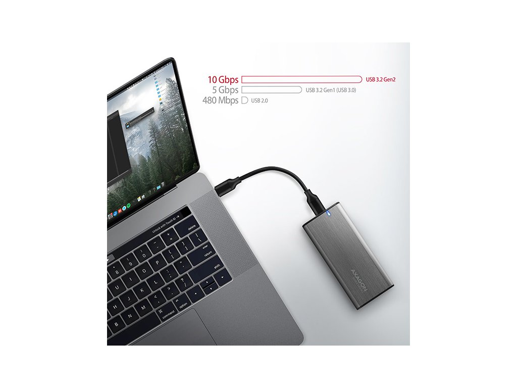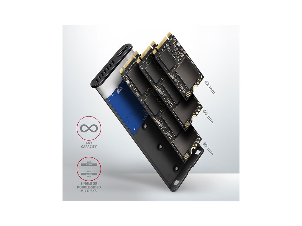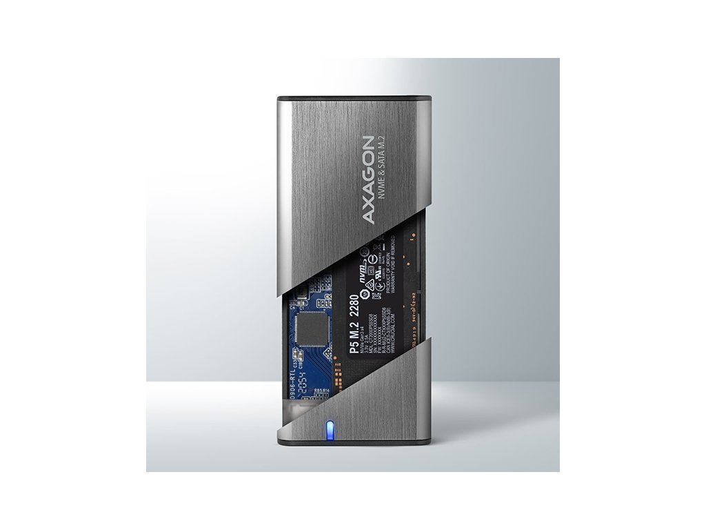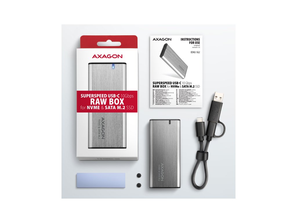 Univerzální externí AXAGON EEM2-SG2 RAW box s USB 3.2 Gen 2 rozhraním určený pro M.2 NVMe nebo SATA SSD disky. Spolehlivé připojení umožňuje oboustranný USB-C konektor na boxu. V balení naleznete nejen kabel USB-C -> USB-C pro připojení boxu k počítači, ale také USB-C -> USB-A redukci. Můžete tak box připojit k jakémukoliv volnému USB portu na notebooku. Druhá generace rychlého USB rozhraní dovolí užívat si rychlost moderních M.2 SSD disků. Díky USB 3.2 Gen 2 rozhraní je přenosová rychlost až 10 Gb/s. Externí M.2 box podporuje i další moderní funkce např. UASP, TRIM a umožňuje čtení S.M.A.R.T. informací monitorujících stav disku. Podpora úsporného režimu při nečinnosti. Unikátní vlastností, díky novému čipsetu, je možnost použití jak M.2 NVMe tak i SATA disků. Nemusíte tak přemýšlet jaký typ M.2 disku do boxu vložíte. Výhodou je uchycení rovnou pro tři různé délky SSD karet - 42, 60 a 80 mm. M.2 karty mohou být jednostranné nebo oboustranné. Box nemá omezení kapacity vloženého SSD disku. Bezšroubkové otevírání boxu usnadňuje montáž i demontáž M.2 SSD disku. Výměna disků je rychlá a snadná a rozšiřuje tak možnosti využití boxu např. pro migraci dat, testování atd. Vnější kovový plášť je proveden v titanově stříbrné barvě s elegantním broušeným povrchem, který brání nežádoucím otiskům prstů. Zaoblený design skříně slibuje příjemné používání. Hliníkové tělo boxu, větrací otvory a teplovodivá podložka zajistí velmi dobré chlazení vloženého M.2 SSD disku. Prodlužuje se tak jeho životnost a také je zamezeno zpomalování rychlosti disku tzv. „Thermal Throttling“. Vložením M.2 SSD disku do tohoto boxu snadno vytvoříte rychlý, kompaktní a univerzální externí disk. Box je možné použít jak s počítači a notebooky, tak s mobilními telefony a tablety. Vstup: • USB 3.2 Gen 2 (USB 3.1 Gen 2) SuperSpeed USB 10 Gbps. • Rychlost až 10 Gbit/s. • Připojení přes reverzibilní USB type C female konektor. Podpora zařízení: • NVMe M.2 SSD disky, • SATA M.2 SSD disky, • určeno pro karty formátu M key nebo B+M key, • NGFF 75-pinový M key slot pro M.2 disky. Další vlastnosti: • Kompatibilní s USB 3.2 Gen 2, zpětně kompatibilní s USB 3.2 Gen 1 (USB 3.1 Gen 1 / USB 3.0), USB 2.0. • Podpora přenosových rychlostí 10.000 / 5000 / 480 Mbit/s (SuperSpeed+ / SuperSpeed / HighSpeed). • Podpora M key nebo B+M key NVMe (PCI-Express) i SATA (AHCI) M.2 SSD disků bez omezení maximální kapacity. • Podpora M.2 disků rozměrů - 2242, 2260, 2280 mm. • Podpora jednostranných i oboustranných M.2 SSD disků. • Vyhovuje PCI Express Base Specification Revision 3.1a specifikaci. • Vyhovuje NVM Express 1.3 specifikaci. • Vyhovuje Serial ATA 3.2 specifikaci (SATA/600), přenosové rychlosti až 6 Gb/s (600 MB/s). • Vyhovuje USB Mass Storage Class specifikaci. • Celková propustnost / přenosová rychlost boxu je dána použitým USB 3.2 Gen 2 rozhraním (teoreticky až 10 Gbit/s). • Reálná propustnost / přenosová rychlost boxu kolem 1000 MB/s (1 GB/s) je dána limity USB 3.2 Gen 2 rozhraní. • Podpora BOT (Bulk-Only Transport). • Podpora UASP (USB Attached SCSI) pro rychlejší přenos dat ve Windows 8 a novějších. • Podpora funkce TRIM pro omezení pozvolné degradace výkonu SSD v čase. • Podpora S.M.A.R.T. (Self-Monitoring, Analysis, and Reporting Technology) systém monitorující stav disku. • Podpora bootování z SSD v externím boxu. • Možnost připojení zařízení za chodu díky podpoře Hot Plug. • Plná podpora Plug and Play. • Podpora úsporného režimu - usínání disku po 5 minutách nečinnosti. • Napájení po USB sběrnici až 900mA z jednoho USB portu zcela dostačuje ve všech případech. • Decentní modrá LED dioda indikující připojení k USB portu počítače (trvalým svitem) a přenos dat (blikáním). • Hliníkové odolné tělo, větrací otvory a teplovodivá podložka napomáhají lepšímu chlazení M.2 SSD disku. • Vyšší povrchová teplota boxu není závadou - díky hliníkovému tělu je teplo generované provozem disku lépe odváděno a předáváno do okolí. • Připojení přes USB 3.2 Gen 2 type C female konektor. • Kabel USB type C male / USB type C male délky 20 cm a redukce USB type C female / USB type A male jsou součástí balení. Další údaje: • Rozměry boxu 94 x 41 x 10 mm. • Hmotnost boxu 35 g (bez kabelu a M.2 disku). Podporované operační systémy: • MS Windows 7 / 8 / 8.1 / 10 / 11 a novější, Windows Server 2008 / 2012 / 2016 / 2019 / 2022 a novější (podporovány všechny 32- i 64-bitové verze OS Windows), Mac OS X 10.x a vyšší, Linux s jádrem 2.6.x a vyšším, Android (nutná podpora ze strany OS a zařízení). • Pozn.: Při použití s Windows 7 je nutné ověřit u výrobce M.2 SSD disku podporu tohoto OS a dostupnost ovladače. Balení v kartonové krabičce s otvorem pro zavěšení obsahuje: • USB-C 3.2 Gen 2 kombinovaný externí box pro M.2 SSD, • USB-C - USB-C kabel délky 20 cm s USB-C - USB-A redukcí, • 1 ks teplovodivé podložky, • montážní materiál, • vícejazyčný návod CZ/DE/DK/ENG/ESP/FIN/FR/GR/HR/HU/IT/NL/PL/PT/RO/RU/SK/SWE/BG/CN/TR/ARA.Dodatočné parametre