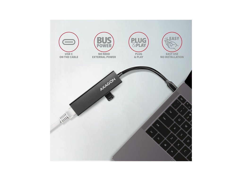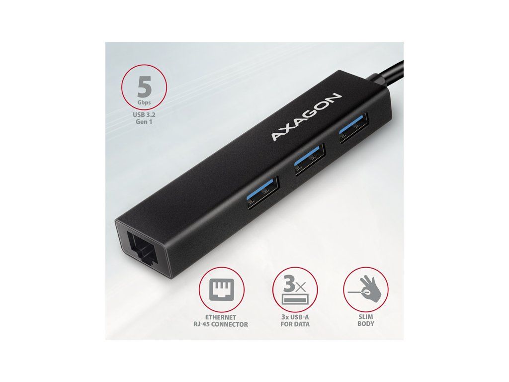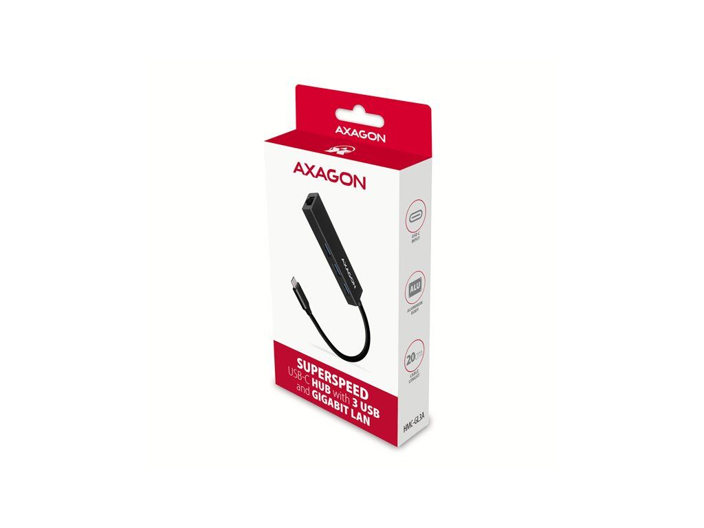 Štíhlý kovový USB-C 3.2 Gen 1 (USB 3.0) multi-port hub AXAGON HMC-GL3A nejen připojí k notebooku nebo počítači až tři USB zařízení současně, ale přidá také gigabitovou síťovou kartu, která připojí váš počítač k vysokorychlostní síti. Kovové tělo hubu je vyrobeno z hliníku a zajišťuje tak dokonalou mechanickou ochranu pro časté přenášení. Elegantní, jemně strukturovaný povrch brání nežádoucím otiskům. Napevno uchycený USB kabel délky 20 cm je ideální pro uživatele mobilních zařízení. Tento kompaktní multi portový hub také zvládne trvalé připojení několika externích disků. Díky rychlému USB 3.2 Gen 1 rozhraní je přenosová rychlost až 5Gb/s. Síťová karta rozšíří počítač o rychlé a stabilní síťové připojení, doplní chybějící síťový RJ-45 konektor nebo přidá další síťovou kartu. LAN adapter je kompatibilní s rychlostmi 10/100/1000 Mbit/s a nabízí také širokou škálu funkcí např. IPv4/IPv6 checksum pro snížení zátěže CPU kontrolními součty, crossover detekci a autokorekci, podporu různých módů Wake-on-LAN funkce, práce s VLAN nebo pokročilé funkce Power Managementu. V moderních operačních systémech od Windows 8.1 výše umožňuje adaptér snadnou automatickou instalaci bez nutnosti připojení k internetu. Replikátor portů je ideálním doplňkem pro ultrabooky s malým počtem USB-A portů a bez síťové karty. Rozbočovač se nezalekne ani připojení k telefonům s USB-C konektorem. K telefonu nebo tabletu tak připojíte například flash disk, klávesnici a myš. Některé telefony a tablety se systémem Android, například Samsung S9+, lze díky tomuto hubu připojit k internetu síťovým kabelem. Vstup: • 1x USB 3.2 Gen 1 / SuperSpeed USB port, konektor USB-C male. • Zpětně kompatibilní s USB 3.1 Gen 1 / USB 3.0 / USB 2.0 a USB 1.1. • Připojovací USB konektor typu C male (samec) umístěn na napevno uchyceném 20 cm kabelu. Výstupy USB: • 3x SuperSpeed USB port, konektory USB-A female. • Podpora přenosových rychlostí 5.000 / 480 / 12 / 1.5 Mb/s (SuperSpeed / High / Full / Low speed). • Celková propustnost / přenosová rychlost je dána použitým USB 3.2 Gen 1 rozhraním (teoreticky 5 Gbit/s). • USB hub zvládne připojení několika externích disků současně. Výstup RJ-45: • Rozhraní Gigabit Ethernet s RJ-45 konektorem pro připojení UTP nebo STP kabelem. • Podporované přenosové rychlosti Ethernet rozhraní 10/100/1000 Mb/s. • Podporované specifikace IEEE 802.3 10Base-T, IEEE 802.3u 100Base-TX, IEEE 802.3ab 1000Base-T. • 10/100/1000 Mb/s autodetekce. • Podpora IPv4/IPv6 packet Checksum Offload Engine (COE) pro snížení zatížení procesoru včetně IPv4 IP/TCP/UDP/ICMP/IGMP & IPv6 TCP/UDP/ICMPv6 kontroly a generování kontrolního součtu. • Podpora TCP Large Send Offload V1 a V2. • Podpora IEEE 802.1P Layer 2 priority encoding & decoding. • Podpora IEEE 802.1Q VLAN tagging. • Podpora IEEE 802.3az EEE (Energy Efficient Ethernet) - snížení spotřeby v klidovém stavu. • Podpora Jumbo frame. • Podpora full-duplex přenosů s IEEE 802.3x flow control i half-duplex přenosů s back-pressure flow control. • Podpora Auto MDI/MDIX - crossover detekce a autokorekce eliminuje potřebu crossover kabelů. • Podpora hardwarového Cyclic Redundancy Check (CRC) pro odhalení chyb přenosu. • Podpora pair swap/polarity/skew korekce. Funkce Wake-on-LAN v různých módech: • Podpora režimu spánku a vzdáleného probuzení přes Magic paket, Microsoft Wakeup Frame, Microsoft Wake Packet Detection a také Link Change wake-up. • Podpora standardu ECMA-393 proxZzzy® for sleeping hosts pro správu síťového připojení spících hostů pomocí proxy serverů. • Podpora technologie RealWoW! umožňuje vzdálené probouzení skrze internet. Pokročilé funkce Power Managementu: Adaptér podporuje pokročilou správu napájení redukující ztráty při klidovém stavu nebo lehkém provozu na síti. Dále podporuje pokročilou úsporu energie při odpojení Ethernet kabelu. • Podpora Advanced Configuration Power management Interface (ACPI). • Podpora Power Management offload (ARP & NS). • Podpora Microsoft Always On Always Connected (AOAC). • Podpora Intel Converged Platform Power Management (CPPM). • Podpora Link Power Management (LPM). • Podpora Operating System-directed Power Management (OSPM). • Podpora IEEE 802.3az EEE (Energy Efficient Ethernet). Další vlastnosti: • Možnost připojení zařízení za chodu díky podpoře Hot Plug. • Plná podpora Plug and Play. • Podpora úsporného režimu. • Kvalitní stíněný kabel zaručuje vysokou rychlost komunikace a minimální nežádoucí interference. • Podpora napájení po USB sběrnici (bus power). • Rozměry 90 x 23 x 13 mm. • Hmotnost 38 g (vč. kabelu). • Délka USB kabelu 20 cm. Podporované operační systémy: • MS Windows XP / Vista / 7 / 8 / 8.1 / 10 / 11 a novější, Windows Server 2003 / 2008 / 2012 / 2016 a novější (podporovány všechny 32- i 64-bitové verze OS Windows), Mac OS X 10.4.x a vyšší, Linux s jádrem 2.6.x a vyšším, Android většina verzí (POZOR - nutno ověřit u výrobce Android zařízení, zda je podporována možnost Ethernet připojení). Balení v kartonové krabičce s otvorem pro zavěšení obsahuje: • SuperSpeed USB-C multi rozbočovač s kabelem napevno délky 20 cm, • multijazyčný manuál CZ/DE/DK/ENG/ESP/FIN/FR/GR/HR/HU/IT/NL/PL/PT/RO/RU/SK/SWE/BG/CN/TR/ARA.Dodatočné parametre