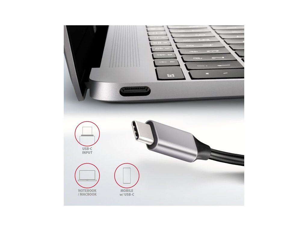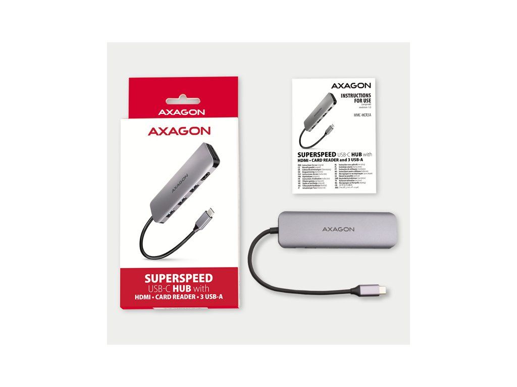 Multiportový USB-C 3.2 Gen 1 hub AXAGON HMC-HCR3A rozšíří Váš notebook, počítač nebo telefon o čtveřici portů a čtečku paměťových karet SD / microSD. Přes oboustranný USB-C konektor snadno a rychle připojíte k počítači tři USB zařízení, paměťové karty a HDMI zobrazovač současně. USB-C hub vám tak poskytne jednoduchou a skladnou dokovací stanici 5v1 k notebooku. USB rozbočovač nabízí tři USB výstupy se standardními USB-A konektory. Hub také zvládne trvalé připojení několika externích disků současně. Díky rychlému USB 3.2 Gen 1 rozhraní je přenosová rychlost hubu až 5Gb/s. Hub dále umožní nabíjení telefonů a tabletů proudem až 1,5A/5V, z hubu tak snadno nabijete např. Android smartphone, Apple iPhone, Apple iPad apod. HDMI výstup poskytuje kvalitní obraz až do rozlišení 4K/30Hz Ultra HD a podporuje přenos vícekanálového zvuku. Podporována jsou také oblíbená hráčská rozlišení WQHD 2560 x 1440 při 60Hz nebo FullHD 1920 x 1080 při 60, 100 a 120Hz max. Pro správné fungování video výstupu je nutné, aby USB-C port notebooku podporoval DisplayPort Alternate Mode (DP Alt Mode) nebo Thunderbolt 3. Čtečka karet podporuje všechny verze SD a microSD karet včetně SDXC a microSDXC s kapacitou až 2TB. Vysoké přenosové rychlosti jsou zajištěny USB 3.2 Gen 1 rozhraním. Card reader umožňuje současnou práci s kartami v obou slotech a přímé kopírování mezi nimi. Elegantní hliníkové tělo zajistí nejen mechanickou odolnost, ale i kvalitní chlazení. Potěší také jemně strukturovaný povrch, na kterém nezůstávají otisky prstů. Replikátor portů je ideálním doplňkem pro notebooky bez USB-A konektorů, čtečky karet a video výstupu. V hubu lze využít Vaše stávající USB periferie bez nutnosti pořizování nových. Díky funkcím Plug and Play a Hot Plug je samotné zapojení hubu velmi jednoduché bez složité instalace a také lze jednoduše připojovat a odpojovat periferie za běhu počítače. Rozbočovač se nezalekne ani připojení k telefonům s USB-C konektorem. K telefonu tak připojíte například flash disk, klávesnici, myš, monitor, TV nebo projektor. Vstup: • 1x USB 3.2 Gen 1 / SuperSpeed USB port, konektor USB-C male. • Zpětně kompatibilní s USB 3.1 Gen 1 / USB 3.0 a USB 2.0. • Kompatibilní s Thunderbolt 3. • Připojovací USB konektor typu C male (samec) umístěn na napevno uchyceném 20 cm kabelu. Výstupy USB: • 3x SuperSpeed USB port, konektor USB-A female. • Podpora přenosových rychlostí 5.000 / 480 / 12 / 1.5 Mb/s (SuperSpeed / High / Full / Low speed). • Celková propustnost / přenosová rychlost je dána použitým USB 3.2 Gen 1 rozhraním (teoreticky až 5 Gbit/s). • USB-C hub zvládne připojení několika externích disků současně. • Nabíjení mobilních zařízení (včetně iPad) proudem až 1.5A v každém z USB portů hubu. Celkový nabíjecí proud (který se dělí na porty) dosahuje až 3A při napětí 5V (záleží na možnostech USB portu počítače). Výstup HDMI: • HDMI. • Konektor HDMI A (F) female. • Maximální podporované rozlišení 4K / 4096 x 2160 při 30 Hz. • WQHD rozlišení 2560 x 1440 při 60 Hz max. • FullHD rozlišení 1920 x 1080 při 60, 100, 120 Hz max. • Pro funkci video výstupu je nutné hub zapojit do USB-C portu s podporou DisplayPort Alternate Mode (DP Alt Mode) nebo do USB-C portu s podporou Thunderbolt 3. Dále je nutný vhodný OS. Bez této podpory nebude funkce video výstupu dostupná. • Podpora HPD (Hot-Plug-Detect). • Podpora TMDS (Transition Minimized Differential Signaling). • Plná podpora HDCP 1.4 a 2.3 (High-bandwidth Digital Content Protection). • Podpora až 8kanálového LPCM zvuku, komprimovaného audia (AC-3, DTS) a HBR audio formátů. • Podpora vzorkovací frekvence až 192 kHz a až 24bitového zvuku – závisí na zdrojovém a koncovém zařízení, tj. notebooku/telefonu a TV/monitoru/AV receiveru. Čtečka karet - dva sloty: • slot Micro SD: microSD / microSDHC / microSDXC / TransFlash, • slot SD: SecureDigital / SDHC / SDXC, MultiMedia Card, MMC 4.0, MMC Dual Voltage, MMC mobile, RS-MMC, s adaptérem - miniSD, microSD / microSDHC / microSDXC, MMC Micro. Čtečka podporuje tyto specifikace flash karet: • SD 1.0/1.1 (SD - Secure Digital, až 2GB). • SD 2.0 (SDHC - Secure Digital High Capacity, až 32GB). • SD 3.0 (SDXC - Secure Digital eXtended Capacity, až 2TB). • MMC a eMMC 3.x /4.0 / 4.1 / 4.2 / 4.3 / 4.4 / 4.5 / 5.0 (8-bit). • Podpora SD 3.01 a SD Jukebox aplikace (CPRM funkce). • Podpora Ultra High Speed bus UHS-I (SDR12/SDR25/SDR50/DDR50/SDR104) rychlost až 104 MB/s. • Podpora hardware ECC (Error Correction Code) funkce a CRC (Cyclic Redundancy Check) funkce. • 2 LUN - v souborových manažerech se čtečka indikuje jako dvě diskové jednotky. Další vlastnosti: • Možnost připojení zařízení za chodu díky podpoře Hot Plug. • Plná podpora Plug and Play. • Podpora úsporného režimu. • Napájení přes USB sběrnici - USB bus power. • Odolné hliníkové tělo pro lepší chlazení hubu. Vyšší povrchová teplota hubu není závadou - teplo generované provozem hubu je lépe odváděno a předáváno do okolí. • Bílá LED indikuje trvalým svitem připojení hubu k počítači. • Kvalitní stíněný kabel zaručuje vysokou rychlost komunikace a minimální nežádoucí interference. • Rozměry 110 x 35 x 12.5 mm. • Hmotnost 58 g (vč. kabelu). • Délka USB kabelu 20 cm. Podporované operační systémy: • Microsoft Windows 10, 11, Mac OS, Linux, Android a Chrome OS. Kompatibilita je závislá na používaném operačním systému a podpoře od výrobce zařízení. • Pozn. 1: Ovladače jsou součástí podporovaných operačních systémů a nainstalují se zcela automaticky. Žádné jiné ovladače není třeba instalovat. • Pozn. 2: DisplayPort Alternate Mode (D