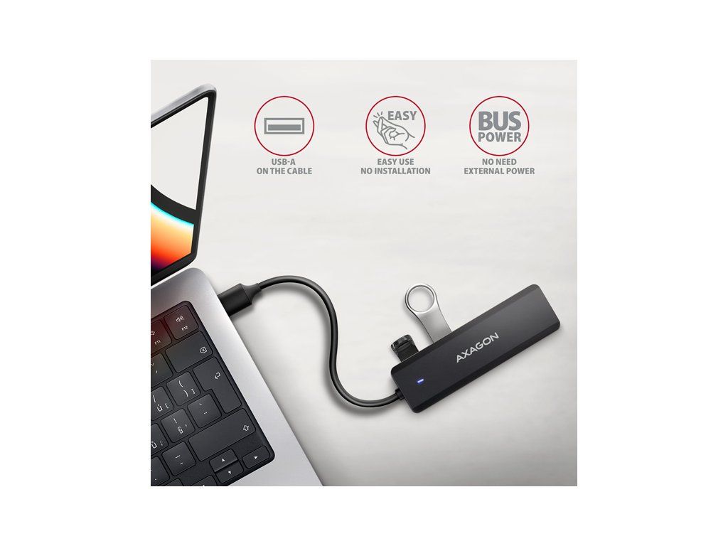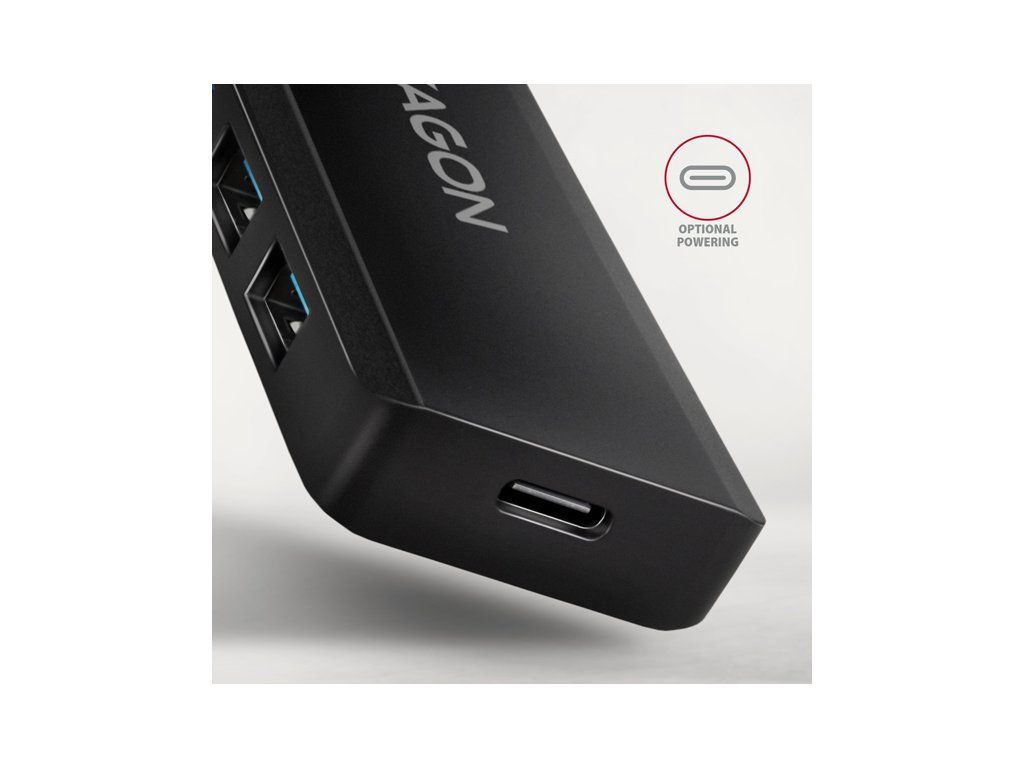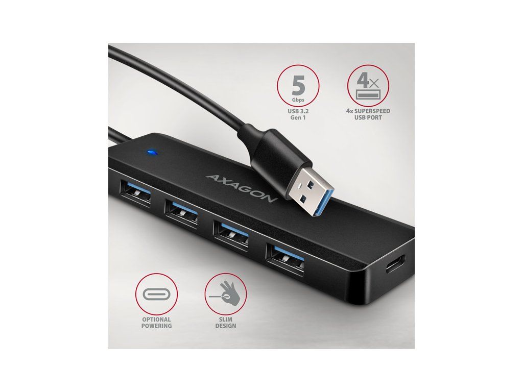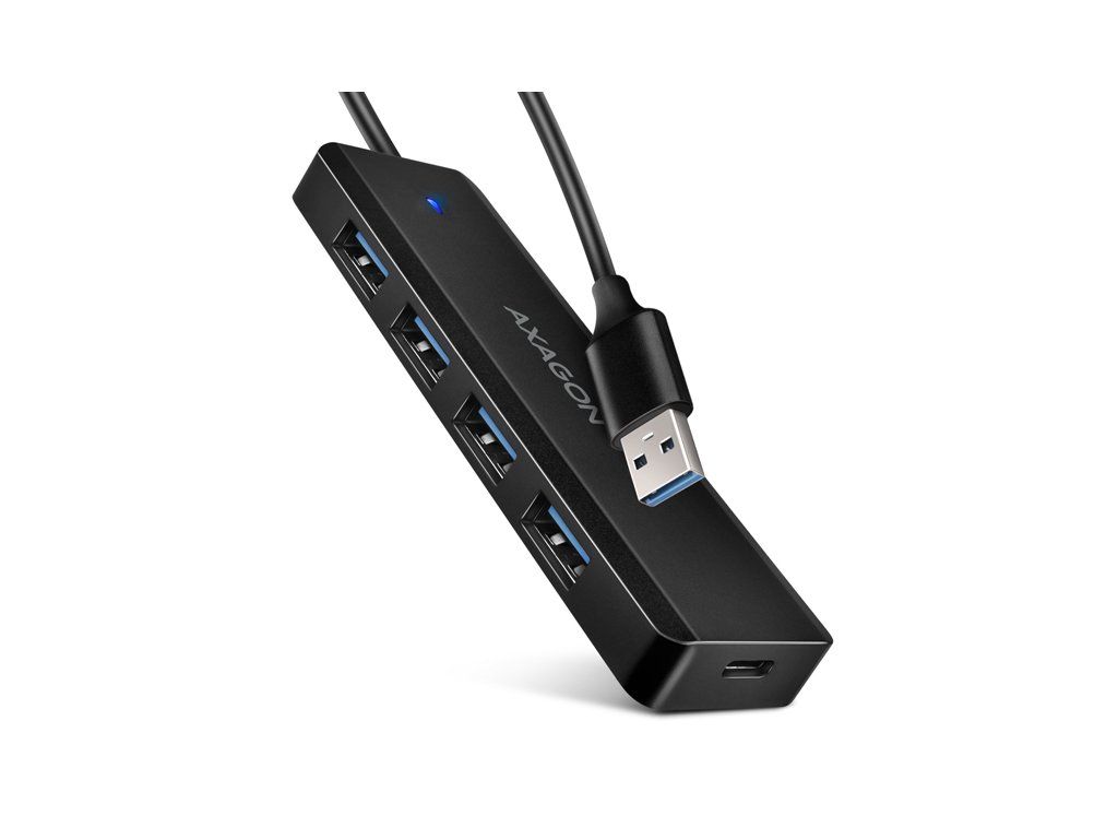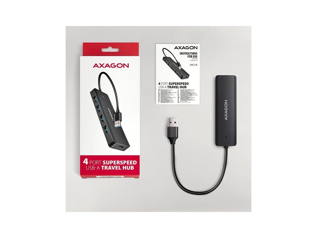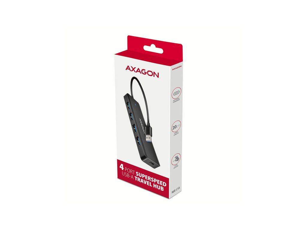 AXAGON HUE-C1A, 4x USB 5Gbps TRAVEL hub, USB-C napájací konektor, kábel USB-A 19cm HUE-C1A