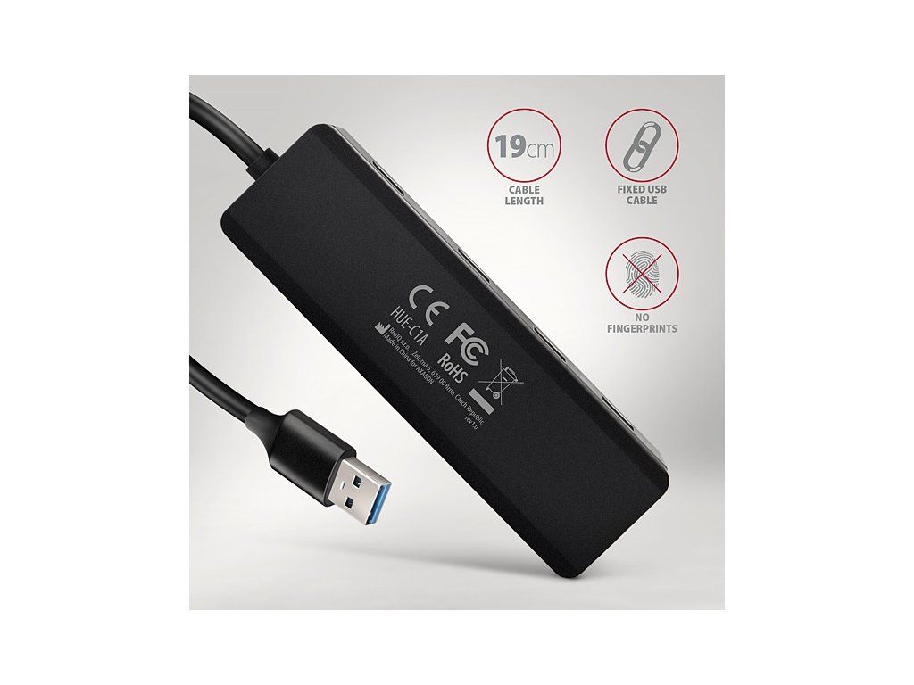 Cestovní USB-A 5Gbps hub AXAGON HUE-C1A snadno a rychle připojí k notebooku nebo počítači až čtyři USB zařízení současně. Napevno uchycený USB-A kabel délky 19 cm je ideální pro uživatele mobilních zařízení. Standard USB 3.2 Gen 1 umožní přenosovou rychlost až 5Gb/s. Všestrannost tohoto kompaktního USB hubu zvyšuje vestavěný USB-C konektor pro dodatečné napájení ze standardních USB nabíječek dodávaných k mobilním telefonům. Díky tomuto přídavnému napájení lze například připojit ještě více externích disků k počítači nebo zvýšit počet nabíjených mobilních telefonů. I bez externího napájení hub zvládne trvalé připojení několika externích disků. Hub také umožňuje nabíjení telefonů a tabletů proudem až 1.5A/5V, z hubu tak snadno nabijete např. Android smartphone, Apple iPhone, Apple iPad apod. Rozbočovač se nezalekne ani připojení k telefonům pomocí vhodné redukce OTG nebo USB-A > USB-C. K telefonu nebo tabletu tak připojíte například flash disk, klávesnici a myš. Vstup: • USB 5Gbps (USB 3.2 Gen 1 / USB 3.0). • Zpětně kompatibilní s USB 480Mbps (USB 2.0) a USB 1.1. • Připojovací USB konektor typu A male (samec) umístěn na napevno uchyceném 19 cm kabelu. Výstupy: • 4x USB 5Gbps, konektory USB-A female. • Podpora přenosových rychlostí 5.000 / 480 / 12 / 1.5 Mbps. • Celková propustnost / přenosová rychlost je dána použitým USB 5Gbps rozhraním (teoreticky 5 Gbps). Vlastnosti: • Možnost připojení zařízení za chodu díky podpoře Hot Plug. • Plná podpora Plug and Play. • Podpora úsporného režimu. • Kvalitní stíněný kabel zaručuje vysokou rychlost komunikace a minimální nežádoucí interference. • Decentní LED indikuje připojení hubu k počítači. • Rozměry 106 x 32 x 11 mm. • Hmotnost 37 g (vč. kabelu). • Délka USB kabelu 19 cm. Režim napájení hubu přes USB kabel (bus power): • Napájení po USB sběrnici je dostatečné pro připojení USB zařízení s nízkým odběrem (myš, klávesnice, čtečka karet, flash disk apod.) nebo vlastním napájením (tiskárna, skener, 3.5'' externí disk) do všech čtyř portů. • USB hub v tomto režimu napájení také utáhne až 2 magnetické 2.5'' externí disky současně. • Nabíjení mobilních zařízení (včetně iPad) proudem až 1A v každém z portů hubu. Režim napájení přes USB + externího napájení hubu z USB nabíječky (self power): • V těle hubu integrovaný USB-C konektor pro přídavné napájení hubu. • Lze použít jakoukoliv nabíječku mobilních zařízení (není součástí balení) s USB-C konektorem (doporučený výstupní proud nabíječky min. 2A). • USB hub v tomto režimu napájení zvládne až 3 magnetické 2.5'' externí disky. Doporučeno pro připojení ke smartphonům a tabletům. • Nabíjení mobilních zařízení (včetně iPad) proudem až 1.5A v každém z portů hubu. Podporované operační systémy: • Windows 8.1 / 10 / 11 a novější, • Windows Server 2012 R2 / 2016 / 2019 / 2022 a novější, • Mac OS X 10.x a vyšší, • Linux s jádrem 2.6.x a vyšším, • Android většina verzí. Balení v kartonové krabičce s otvorem pro zavěšení obsahuje: • USB-A rozbočovač s kabelem napevno délky 19 cm, • vícejazyčný návod CZ/DE/DK/ENG/ESP/FIN/FR/GR/HR/HU/IT/NL/PL/PT/RO/RU/SK/SWE/BG/CN/TR/ARA.Dodatočné parametre