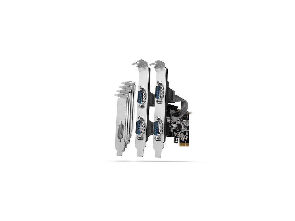 PCI-Express karta so štyrmi sériovými portami 250 kbps. ASIX AX99100. Standard & Low profile. Vstup rozhranie PCI-Express 2.0 počet liniek 1-Lane (x1) rýchlosť 5 Gbit/s kompatibilita PCI-Express 1.0a / 1.1 / 2.1 / 3.0 kompatibilita x1 / x4 / x8 / x16 PCIe slot Výstup rozhranie sériové RS-232 rýchlosť max. 250 kbit/s počet portov 4 konektor 4x DB9 samec kompatibilita UART 16C950 / Extended 16C550 / 16C550 Podporované vlastnosti nastaviteľné riadenie toku Xon / Xoff, Hardware, None nastaviteľná dĺžka slová 5 / 6 / 7 / 8 / 9 b nastaviteľná parita Even, Odd, None, Mark, Space / 1, 1.5, 2 stop bits Plug and Play áno Ďalšie vlastnosti buffer áno (FIFO odosielacie 256B / prijímacie 256B pre každý port) standard profile áno low profile áno čipset ASIX AX99100 Napájanie po zbernici PCI-Express bus power Podpora OS MS Windows 10 / 8.1 / 8 / 7 / Vista / XP MS Windows Server 2016 / 2012 / 2008 / 2003 Linux 2.6.11 jadro a vyššieDodatočné parametre