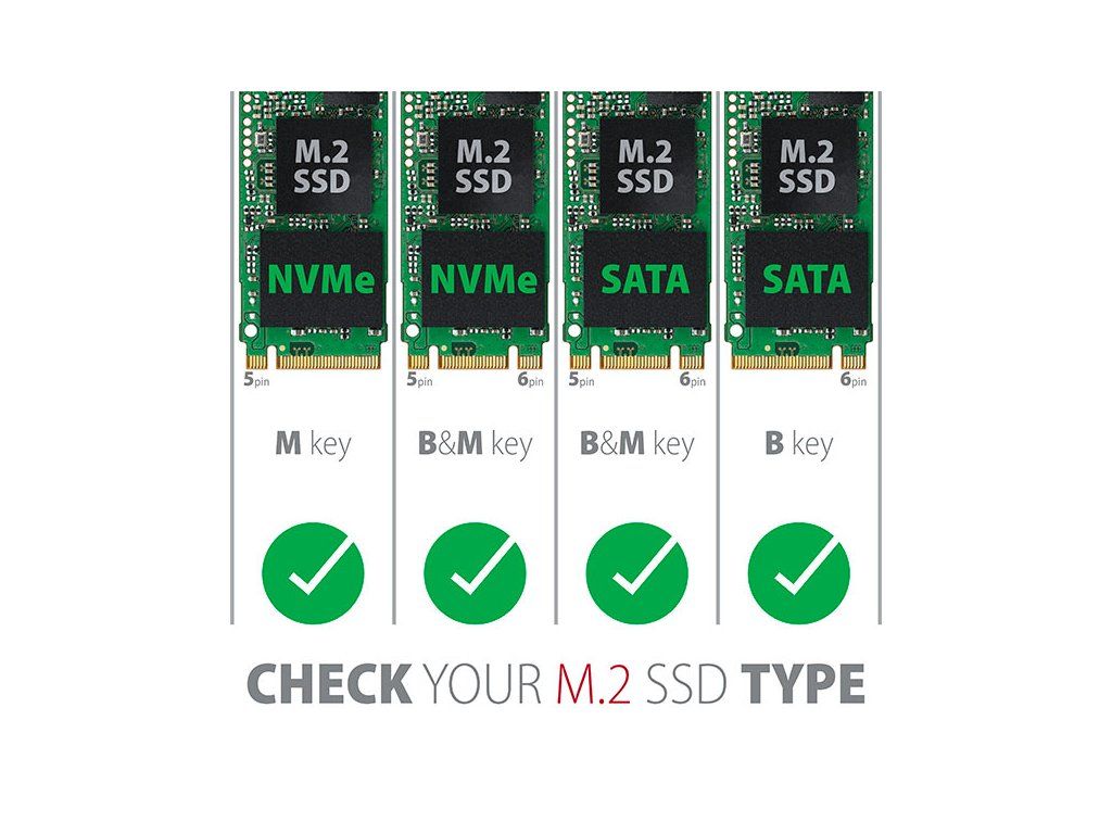 Adaptér podporuje použitie SATA i NVMe (PCI-Express) M.2 SSD diskov, jednostranných i obojstranných. Redukcia nemá obmedzenia kapacity SSD diskov a možno použiť M.2 karty všetkých rozmerov až do dĺžky 110 mm. Samozrejmosťou je fungovanie oboch diskov zároveň.