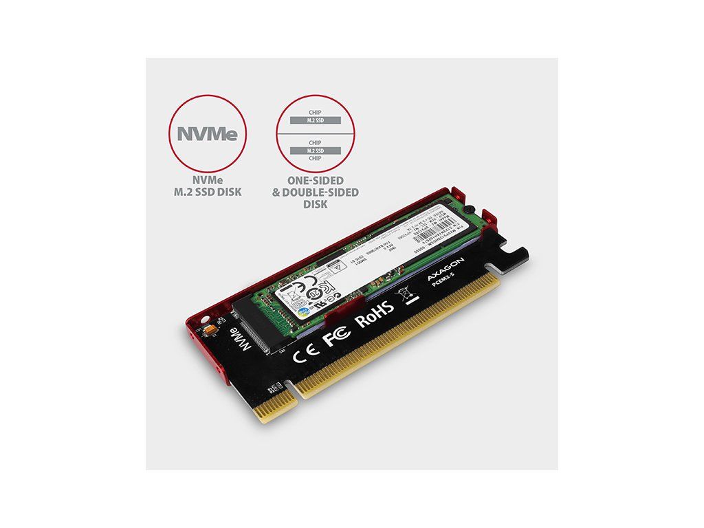 Adaptér podporuje použitie NVMe (PCI-Express) M.2 SSD diskov, jednostranných i obojstranných. Redukcia nemá obmedzenie kapacity SSD diskov a je možno použiť M.2 karty až do rozmeru 22x80 mm.