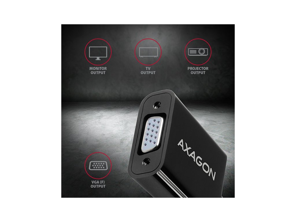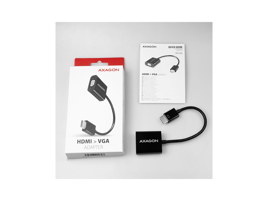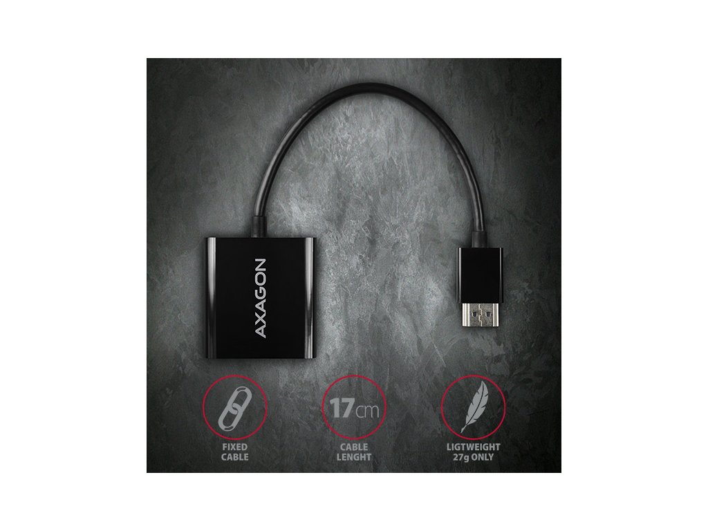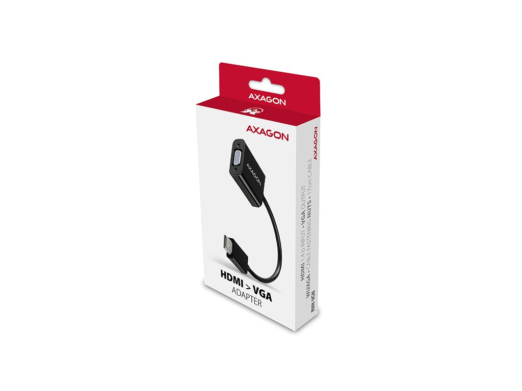 HDMI -> VGA aktivní adapter AXAGON RVH-VGN pro připojení staršího VGA monitoru/TV/dataprojektoru k počítači nebo jinému zařízení s výstupem HDMI. Redukci lze použít i se set-top boxy nebo herními konzolemi Xbox a PlayStation. Hardwarový převodník bez potřeby jakékoliv instalace či nastavování zajistí přenos obrazu až do rozlišení 1920x1200 (WUXGA) při obnovovací frekvenci 60Hz. Inovované provedení elektroniky adaptéru zajišťuje vysoce kvalitní čistý a ostrý obraz. Redukce je pouze jednosměrná, tj. převodník z HDMI na VGA, ne naopak. Vstup: • digitální rozhraní HDMI v1.4b • konektor HDMI A (M) male (samec) Výstup: • analogové rozhraní VGA • konektor D-Sub 15-pin (F) female (samice) Podporovaná rozlišení: • max. 1920x1200 (16:10) WUXGA • 1920 x 1080 (16:9) Full HD/1080p • 1680 x 1050 (16:10) WSXGA+ • 1600 x 1200 (4:3) UXGA • 1600 x 900 (16:9) HD+ • 1440 x 900 (16:10) WXGA+ • 1400 x 1050 (4:3) SXGA+ • 1366 x 768 (16:9) WXGA • 1360 x 768 • 1280 x 1024 (5:4) SXGA • 1280 x 960 (4:3) SXGA- • 1280 x 800 (16:10) WXGA • 1280 x 768 (5:3) WXGA • 1280 x 720 (16:9) HD/WXGA/720p • 1280 x 600 • 1152 x 864 (4:3) XGA+ • 1024 x 768 (4:3) XGA • 800 x 600 (4:3) SVGA • 640 x 480 (4:3) VGA • 576i/576p PAL • 480i/480p NTSC Pozn.: Rozlišení je závislé na parametrech monitoru/TV/projektoru a grafického adaptéru. Další vlastnosti: • podpora HDCP 1.4 ochrany proti kopírování obrazového a zvukového obsahu, • podporované módy: zrcadlení plochy primárního monitoru, rozšíření plochy primárního monitoru a další, • napájení z HDMI vstupu - není potřeba žádné externí napájení, • kompaktní rozměry 42 x 38 x 16 mm, • délka kabelu napevno cca. 17 cm, • hmotnost 27g, • provozní teplota: 0 ~ 40°C, • skladovací teplota: -20 ~ 85°C. Podporované operační systémy: • Všechny verze MS Windows, Mac OS X, Linux, Android, Chrome a dalších operačních systémů. • Jde o čistě hardwarový převodník, převod zajišťuje pouze čip adaptéru bez účasti počítače, žádné ovladače se neinstalují, kompatibilita tedy není závislá na používaném operačním systému. Balení v kartonové krabičce obsahuje: • převodník HDMI > VGA, • tištěný multijazyčný manuál CZ/DE/DK/ENG/ESP/FIN/FR/GR/HR/HU/IT/NL/PL/PT/RO/RU/SK/SWE/BG/CN/TR/ARA.Dodatočné parametre
