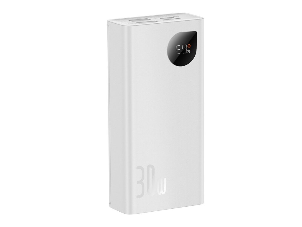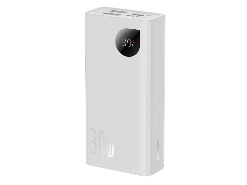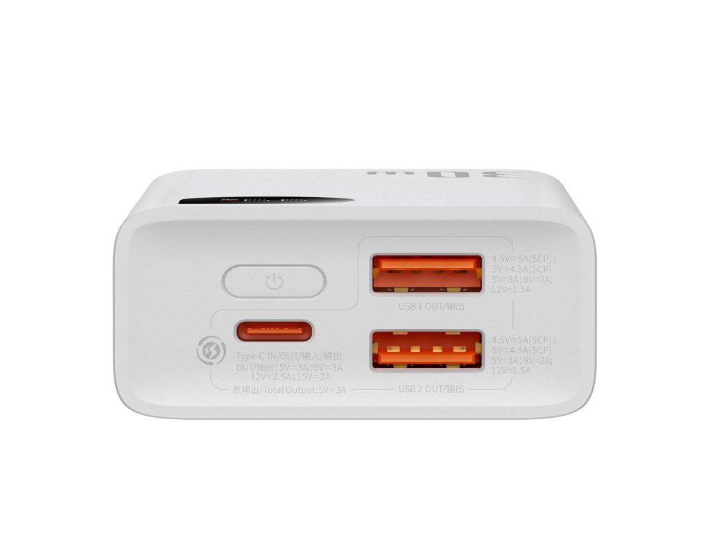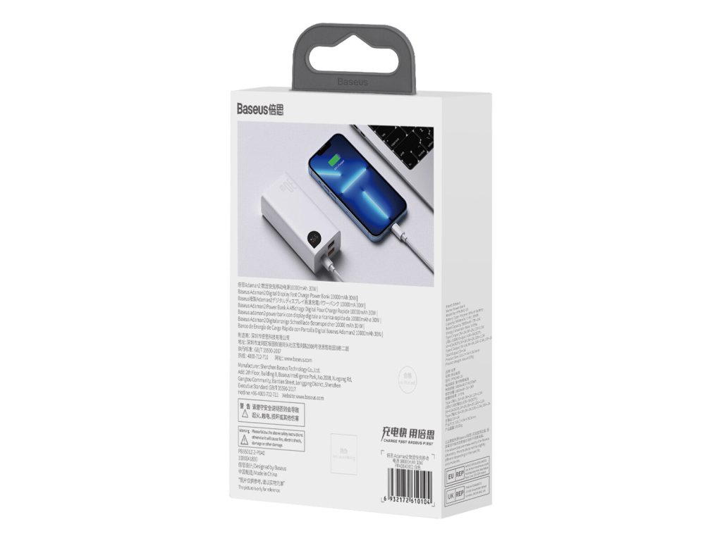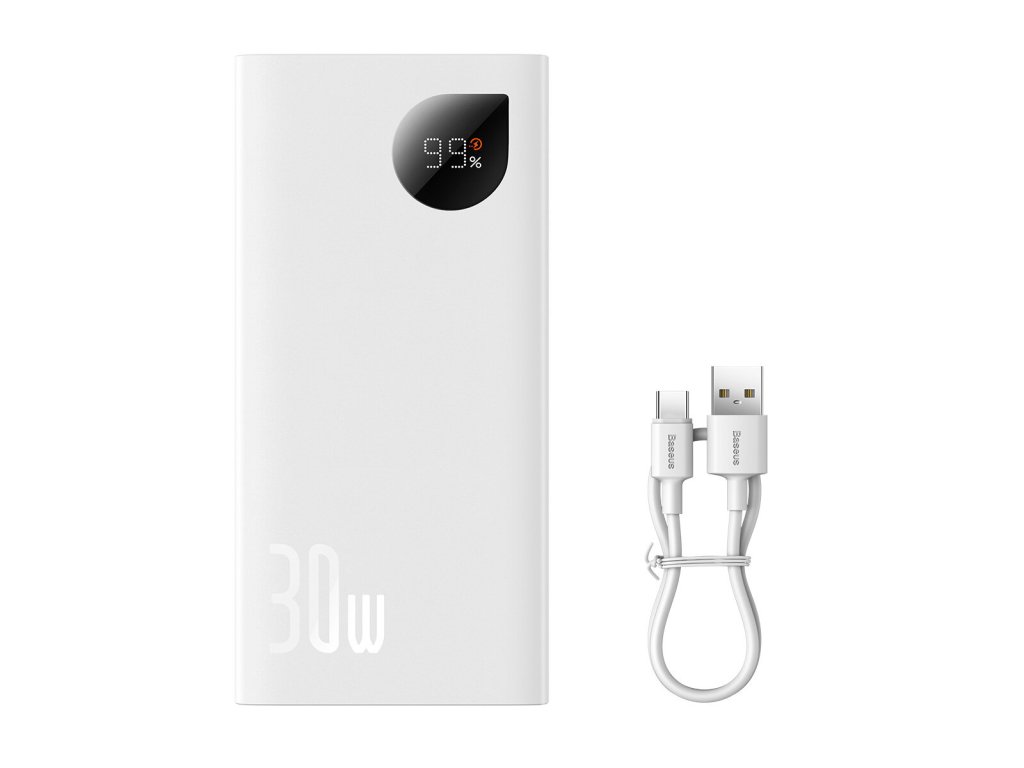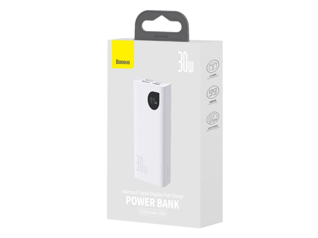 Baseus Adaman2 powerbanka s digitálním displejem 10000mAh 30W Vlastnosti * výstupní výkon 30W * současné nabíjení až 3 zařízení * LED displej indikuje úroveň nabití baterie * rychlé nabíjení: PD (Power Delivery), SCP (Huawei Super Charge Protocol), FCP (Huawei Fast Charge Protocol), QC (Qualcomm Quick Charge), AFC (Samsung Adaptive Fast Charging) Technické parametry Typ baterie: lithium-polymer Kapacita baterie: 10000mAh/37Wh Celkový výstupní proud: 5V/3A Barva: bílá Rozměry: 111,2x54x26,5mm Hmotnost: 206g Porty: * 2x USB-A: 4,5V/5A, 5V/4,5A, 5V/3A, 9V/2A, 12V/1,5A (výstup) * 1x USB-C: 5V/3A, 9V/2A, 12V/1,5A (vstup), 5V/3A, 9V/3A, 12V/2,5A, 15V/2A (výstup) Záruka: 2 rokyDodatočné parametre