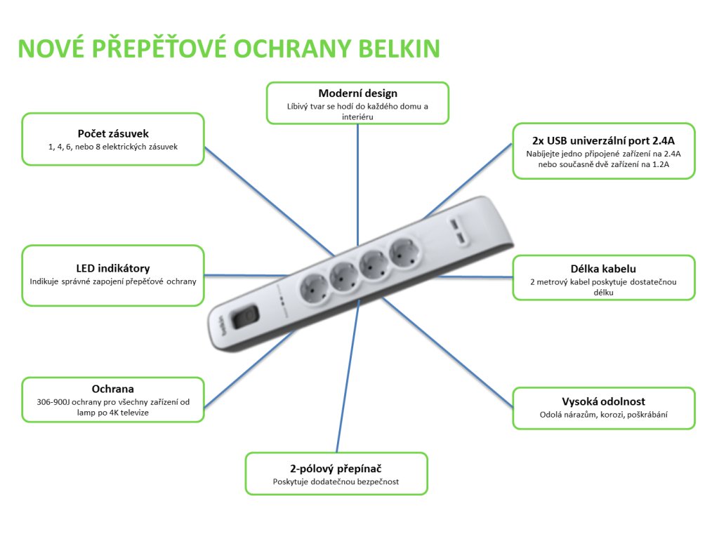 Vlastnosti produktu: * 6 zásuvek s přepěťovou ochranou + 2 univerzální porty USB 2.4A (sdílené) * USB porty pro ideální nabíjení vašeho tabletu a smartphonu v té nejvyšší rychlosti * Ochrana proti přepětí 650 J * Pro ochranu vašich domácích elektrických spotřebičů jako jsou DVD přehrávače, herní konzole, repro soustavy a jiné středně velké zařízení * 2-pólový přepínač * Délka kabelu 2 metry * Plně certifikovaný pro region EMEA * Retail balení Přepěťová ochrana je určena pro Evropský trh, v ČR/SK bohužel nefunguje funkce indikace uzemnění z důvodu odlišné stavby zásuvek. Nicméně přepěťová ochrana je plně funkční, signalizace uzemnění nemá vliv na její funkciDodatočné parametre