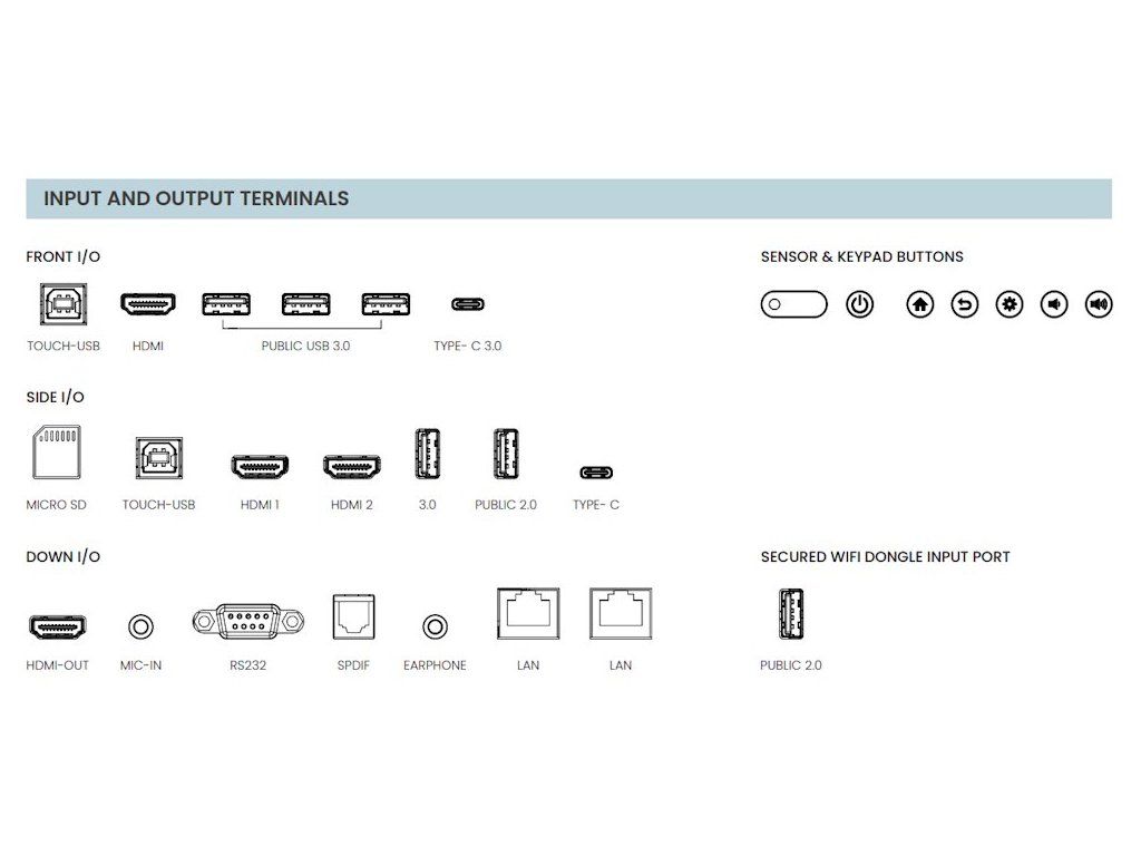 Tvrzené sklo tloušťky 3,2 mm s tvrdostí 9H a antireflexní úpravou chrání displej před poškozením. Zařízení nabízí kompletní konektivitu včetně USB-C s Power Delivery 65 W, RS-232 pro profesionální instalace a duální LAN porty pro Android i OPS modul.