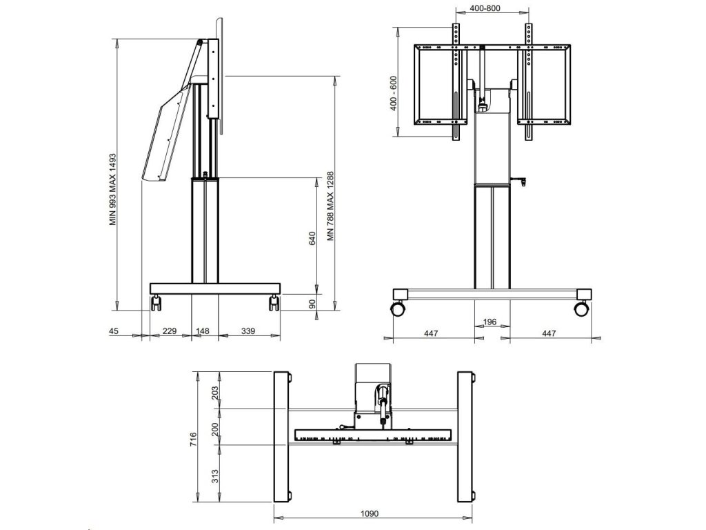 Stojan na televízory a monitory, ktorý má plne motorické nastavovanie výšky aj náklonu obrazovky, ovládanie pomocou ovládacieho panelu. Kedykoľvek môžete zmeniť výšku obrazovky v rozmedzí od 788mm až do 1288mm (výška od podlahy po stred obrazovky) a náklon obrazovky od 0° (obrazovka je zvisle) až do 90° (obrazovka je vodorovne) jednoducho a rýchlo stlačením tlačidla na diaľkovom ovládači. Konštrukcia televízneho stojana je profesionálnej kvality, zaviesť je možné televízory a monitory s hmotnosťou až 150kg.
