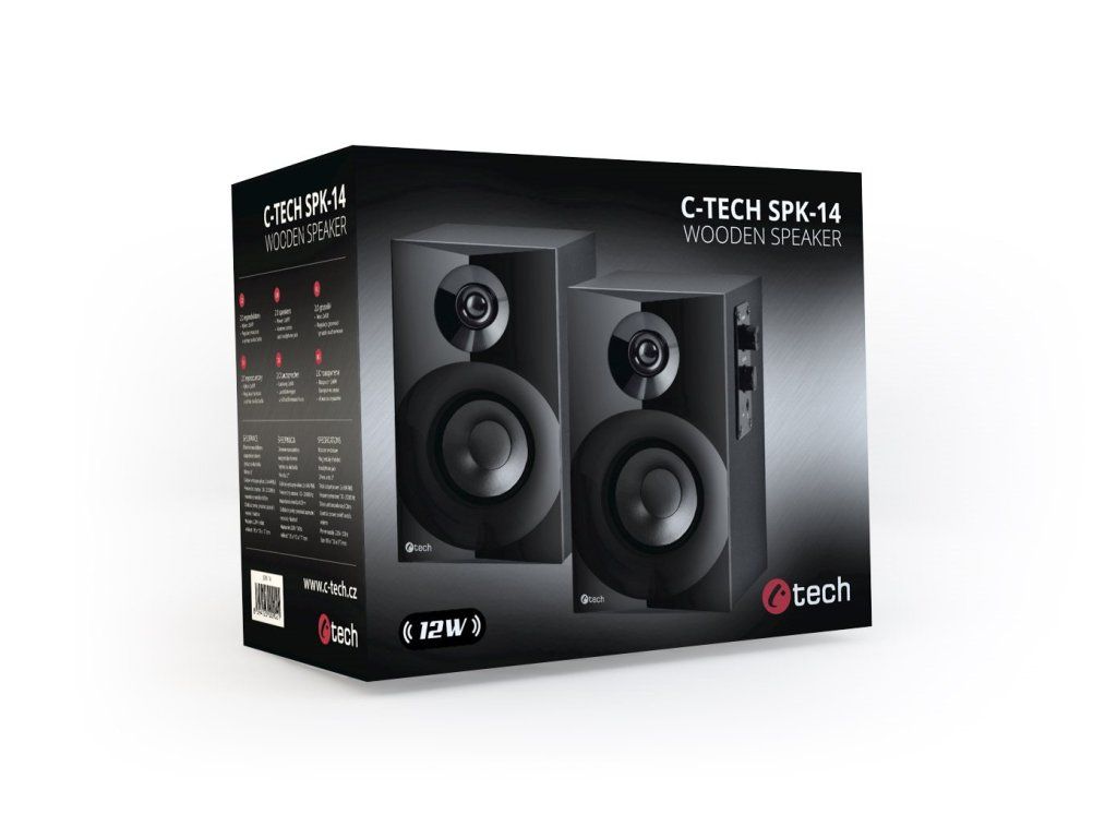 Drevené dvojpásmové reproduktory C-TECH SPK-14 sú vďaka svojmu dizajnu vhodné do moderných kancelárií alebo miestností. Na bočnom paneli reproduktorov sa nachádza ovládanie hlasitosti a praktický výstup na slúchadlá. Tento reproduktor ponúka celkový výkon 12 W RMS, čo postačuje na kvalitné a hlasné počúvanie hudby. Reproduktory sú napájané zo siete a k počítaču sa pripájajú pomocou 3,5 mm jack kábla