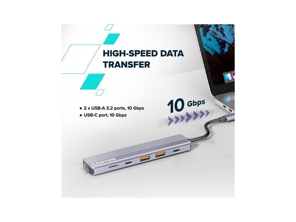 Hub je vybavený dvoma portami USB-A 3.2 a jedným portom USB-C, ktoré ponúkajú rýchlosť prenosu dát až 10 Gb/s. Prenášajte veľké súbory, fotografie a videá v priebehu niekoľkých sekúnd a udržujte svoj pracovný postup plynulý a neprerušovaný.