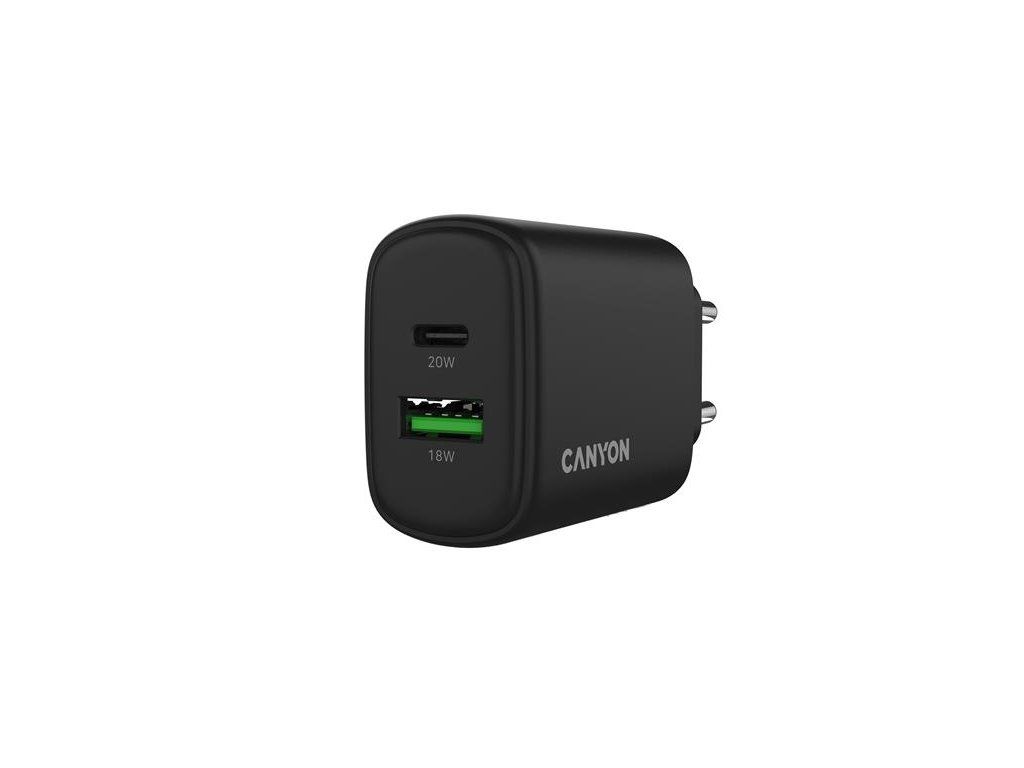 Canyon OnCharge 200, univerzálna nabíjačka do steny, 1x USB-C + 1x USB-A, PD 20W, čierna CNE-CHA200-31