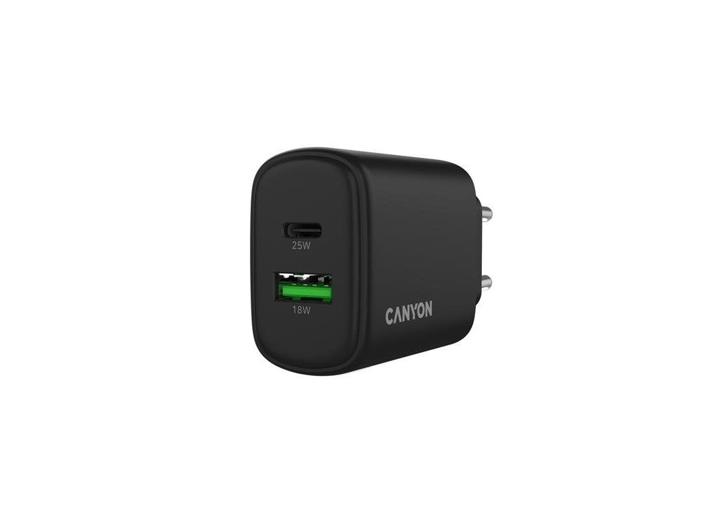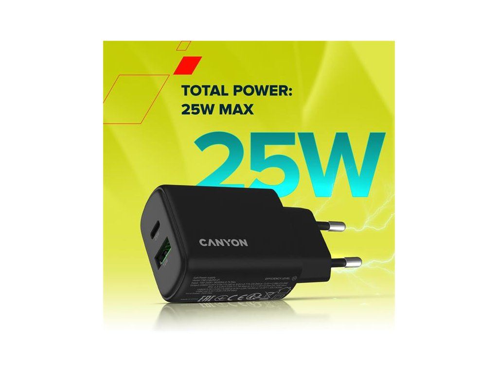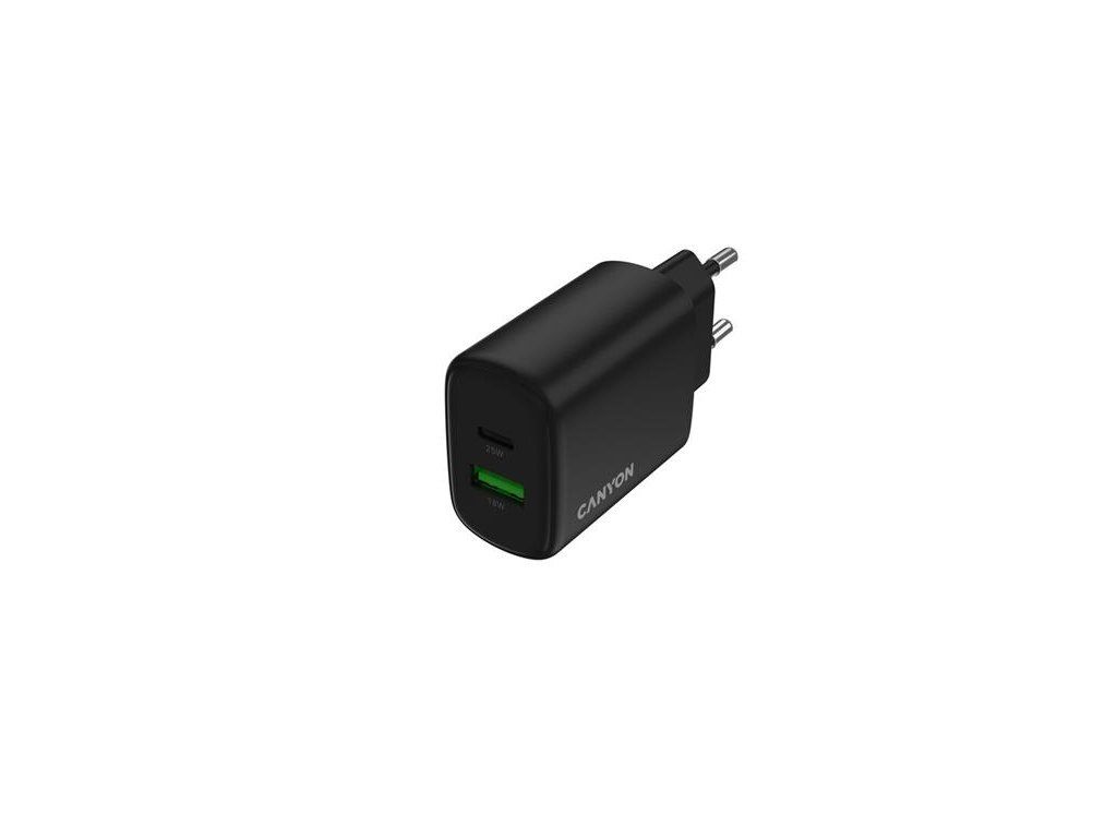 Canyon OnCharge 250, univerzálna nabíjačka do steny, 1x USB-C + 1x USB-A, PD 25W, čierna CNE-CHA250-31
