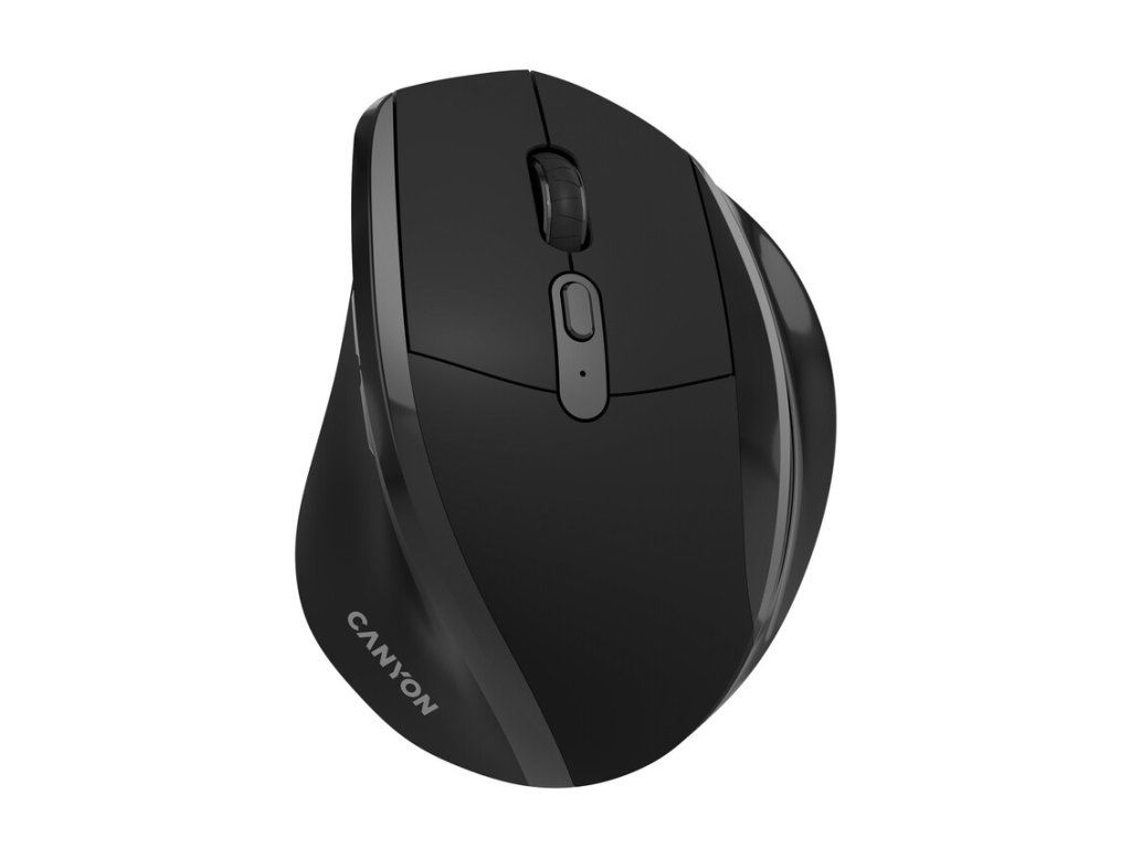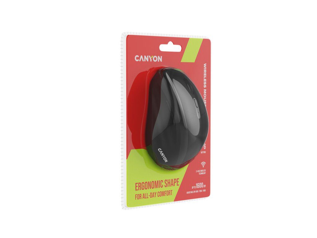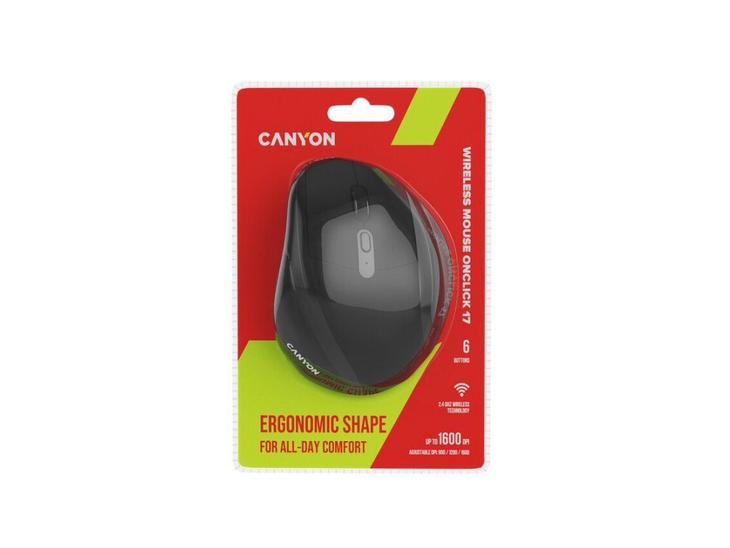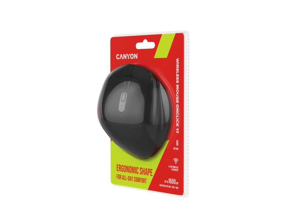 Canyon OnClick 17, ergonomická bezdrôtová optická myš, USB prijímač, 6 tlačidiel, 800/1200/1600 DPI, čierna CNE-CMSW17B