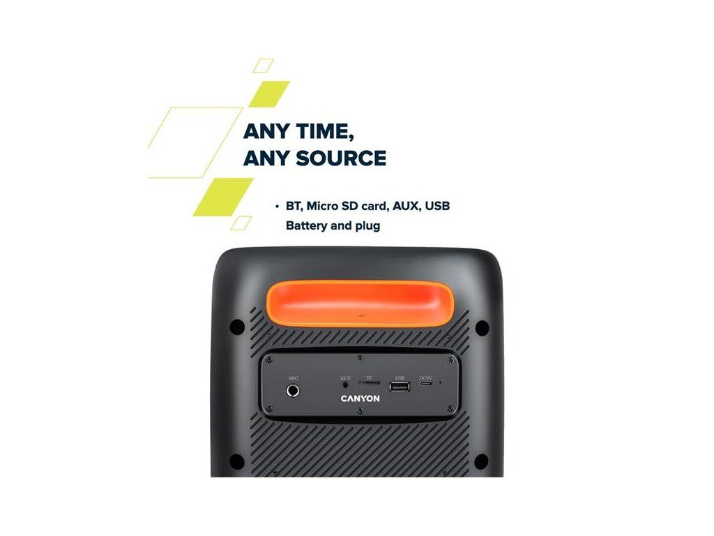 Viete si predstaviť dobrú párty bez hudby? My teda nie! Reproduktor Canyon OnFun 5 zachráni Vaše podujatie od nudy. S vykonom 40W a kompletnou paletou párty osvetlenia sa stane absolútnym centrom pozornosti. Hudbu dokážete prehrávať prostredníctvom technológie Bluetooth 5.0, pripojením zdroja hudby (smartfón, tablet) cez AUX vstup, USB, alebo z čitačky kariet Micro SD. A očakávajte ďaleko viac funkcií: prístroj disponuje konektorom 6.3mm jack pre pripojenie mikrofónu či gitary. Cez reproduktor môžete prehrávať živú hudbu, alebo si užiť karaoke s priateľmi - tento reproduktor je stvorený pre zábavu! Súčasťou prístroja je ekvalizér so šiestimi režimami, ktorým podľa Vašich preferencií nastavíte zvuk bez ohľadu na žáner. Pokiaľ máte záujem, aby hudba hrala počas Vašej zábavy ešte hlasnejšie, prepojte spolu až 2 reproduktory v režime True Wireless Stereo. Oba repráky sa zosynchronizujú a Vy sa do hudby ponoríte dokonale. V režime Bluetooth pripojenia majú akumulátory reproduktora výdrž až 4 hod prehrávania hudby. Či organizujete párty, alebo iné podujatie, reproduktor Canyon OnFun 5 je ideálnym riešením, aby to tam žilo!VLASTNOSTI / ŠPECIFIKÁCIE