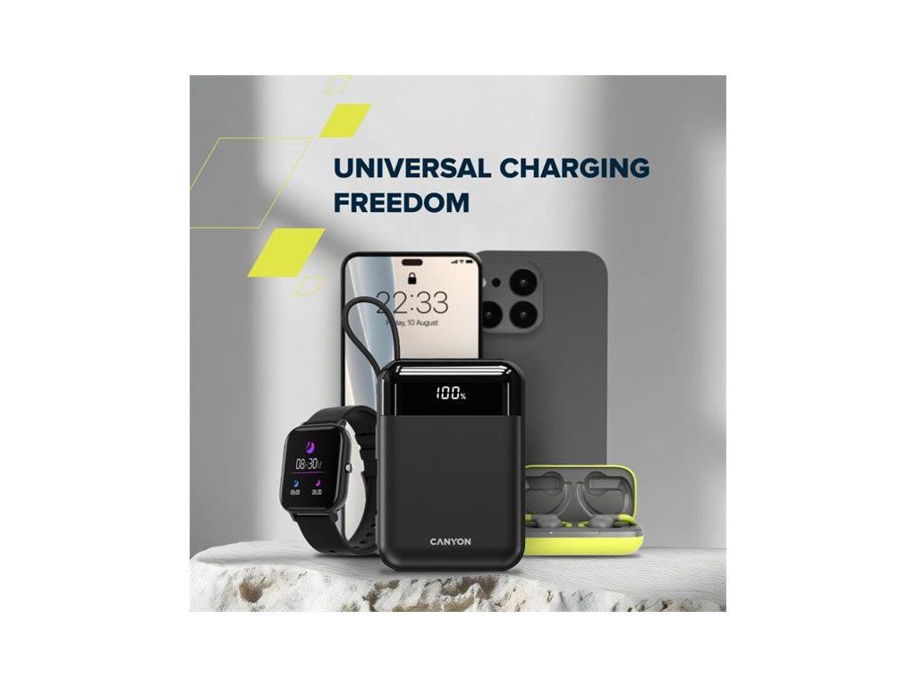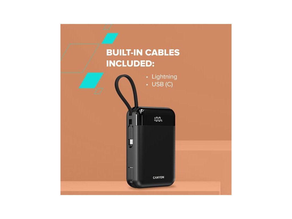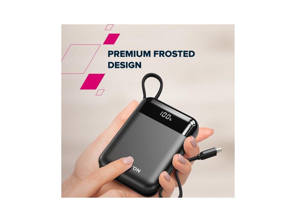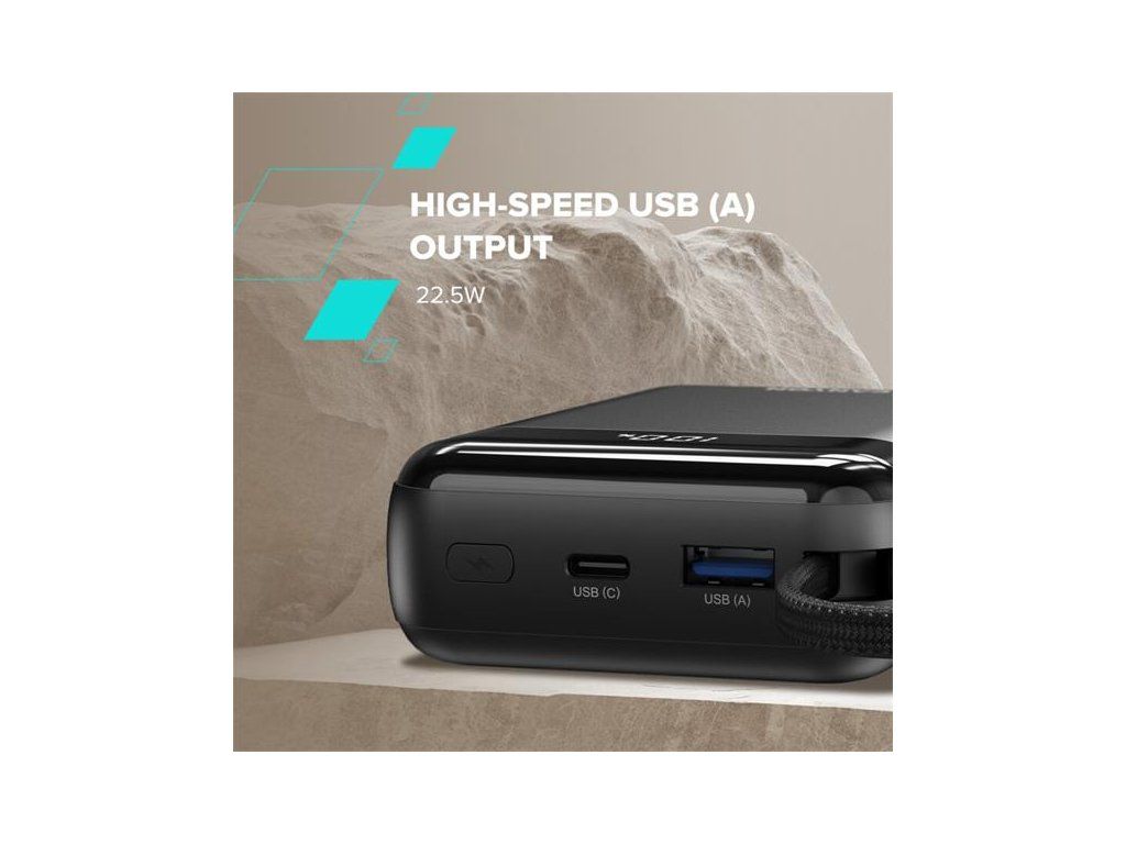 - Porty: 1× USB-C, 1× USB-A + vstavané káble USB-C a Lightning