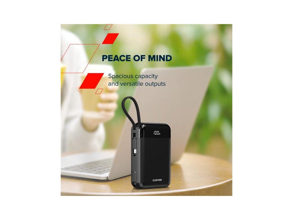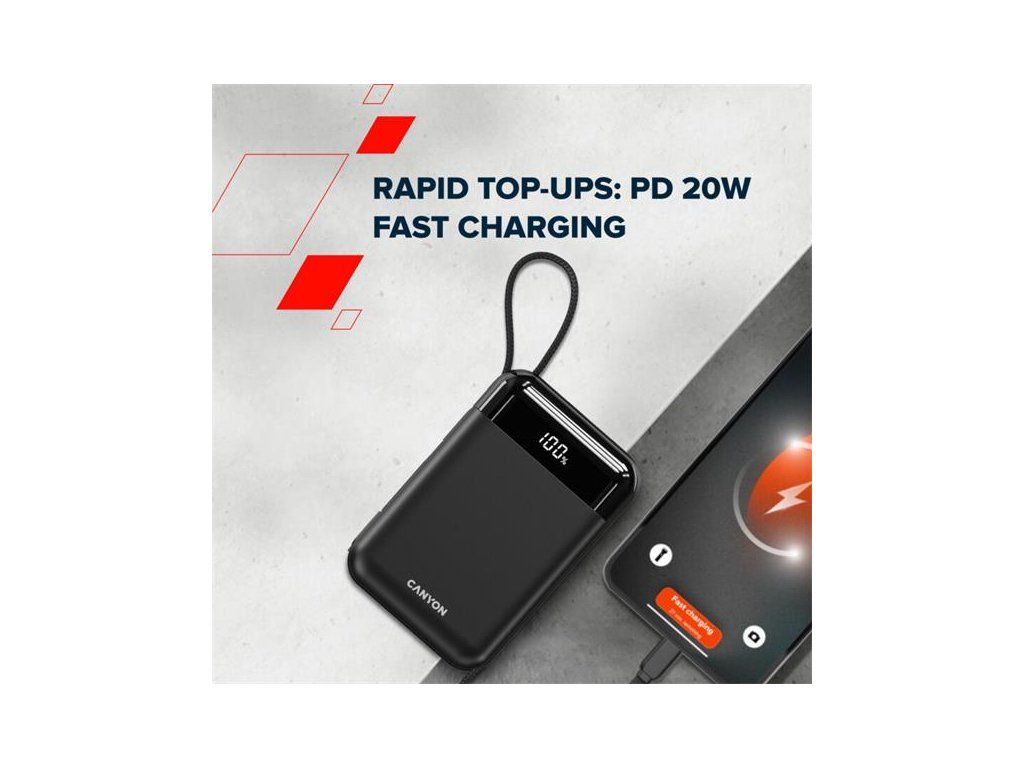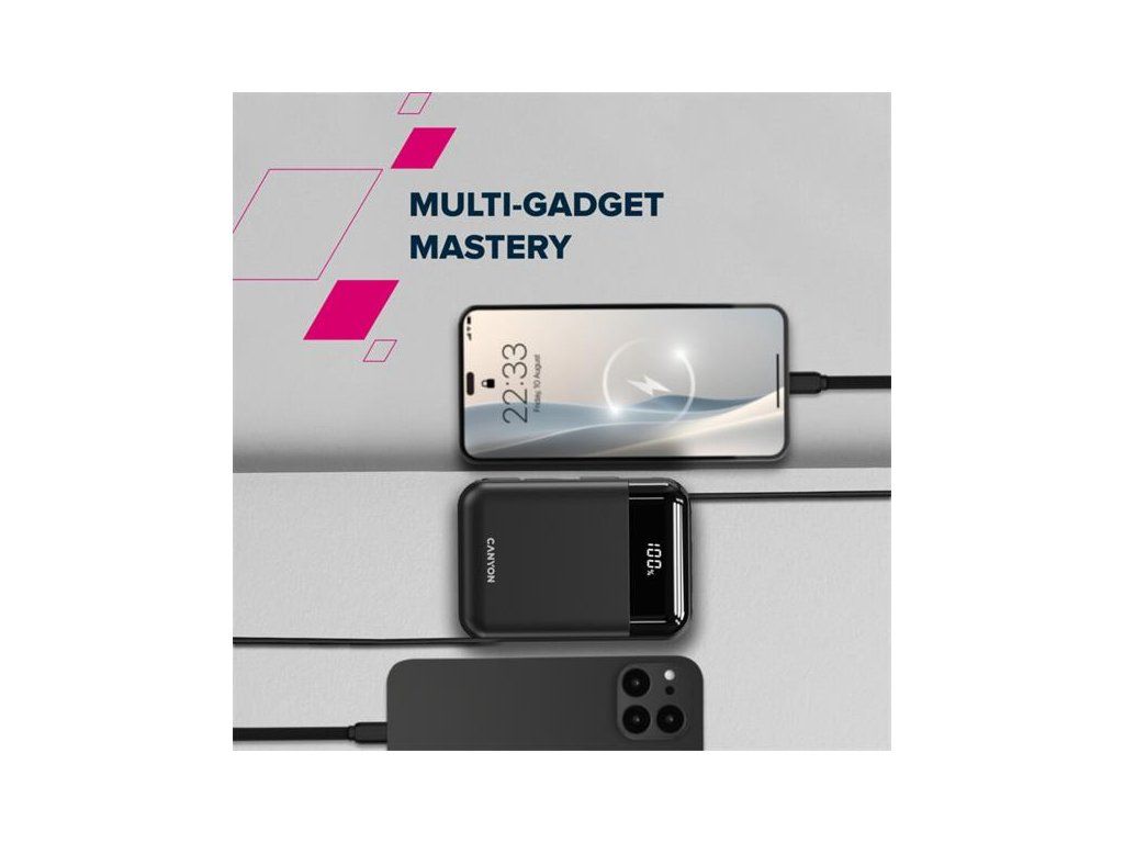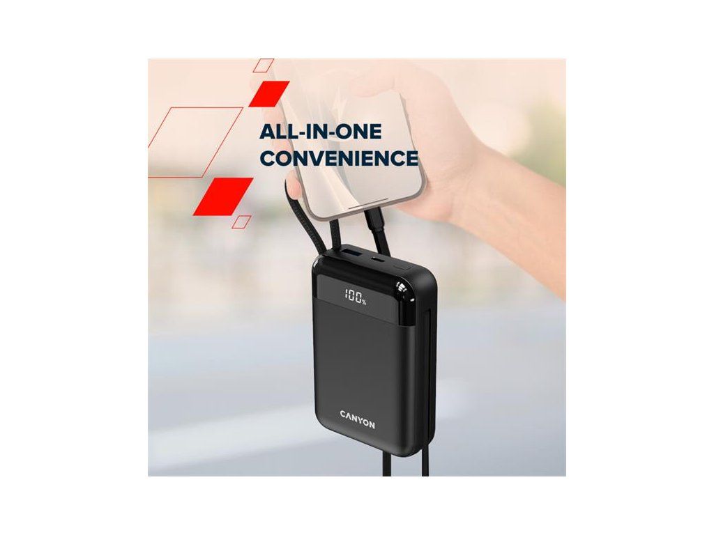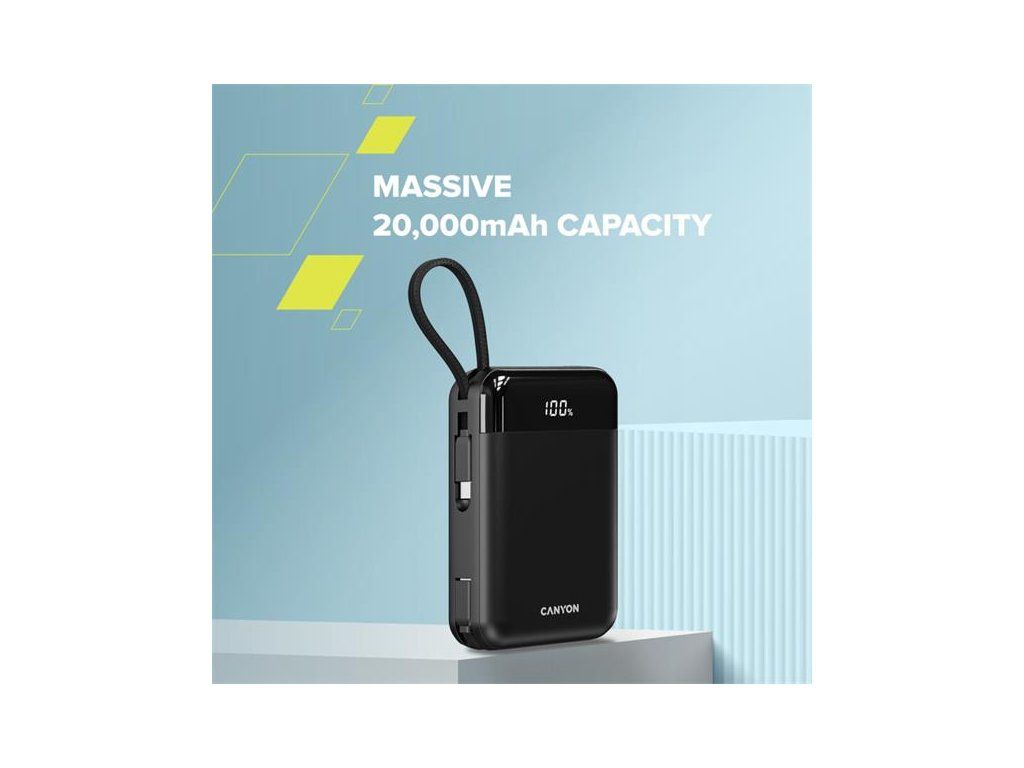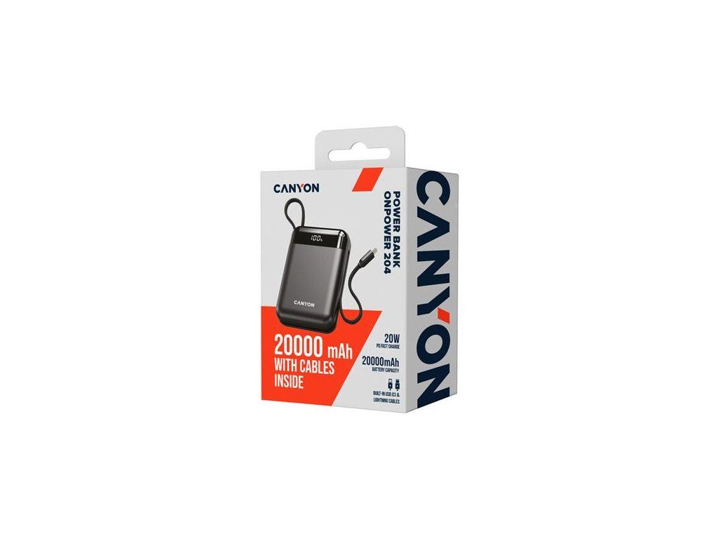 Canyon OnPower 204, Powerbanka, 20 000 mAh, 22.5 W, in/out: USB-C/USB-A, integr. káb. Ligtning+USB-C CNS-CPB204B