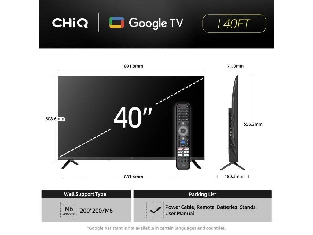 CHiQ 40“ L40FT, ultratenká, bezrámečková Smart Google TV s HDR10, HLG, obrazovkou s Full HD s rozlíšením 1920 x 1080 pixelov, Dolby Audio a vylepšeným zvukom dbx-tv.
