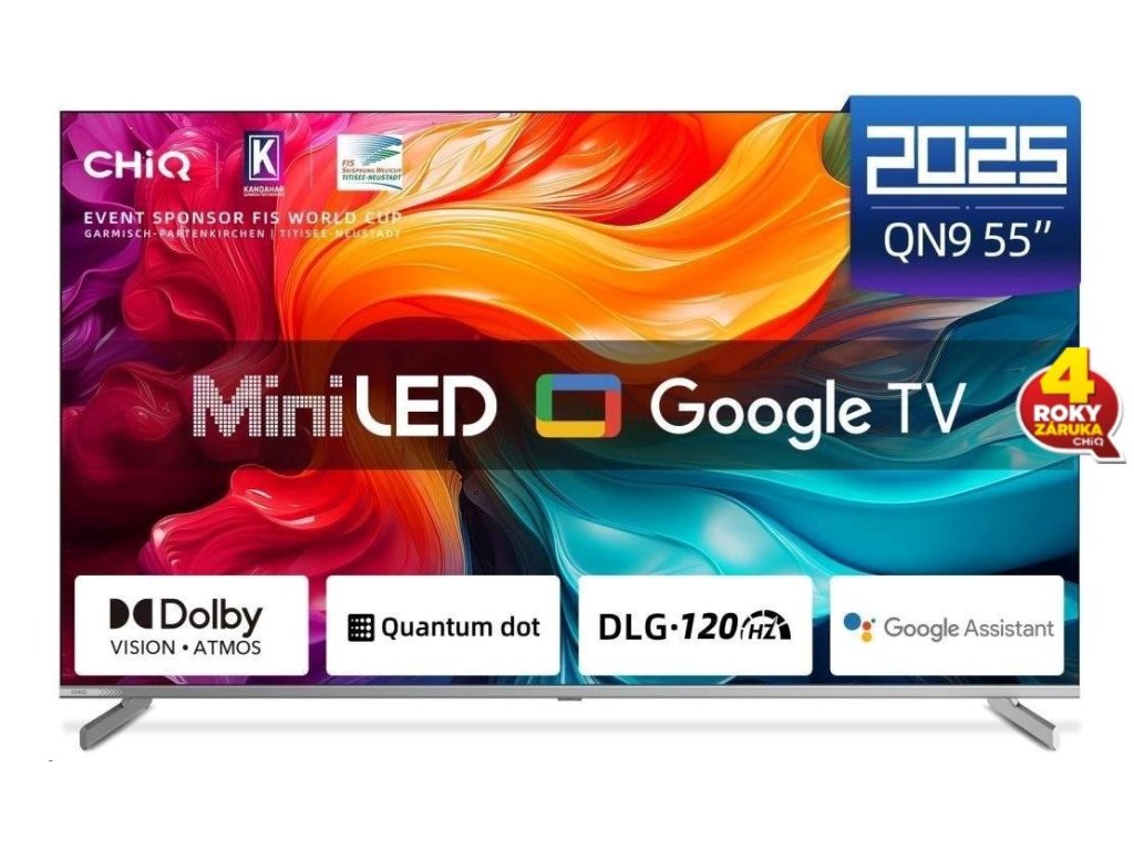 CHiQ M55QN9V, 55" (139 cm), kovová bezrámová Smart MiniLED Google TV 5.0, Ultra HD (4K), DLG 120 Hz, MEMC, lokálne stmievanie, Dolby Atmos, Dolby Audio, dbx-tv, HDR 10, HLG, Dolby Vision, WiFi 2,4/5G, Bluetooth 5.0, webový prehliadač, Google Assistant, Chromecast, O2 TV, YouTube, Netflix, Prime Video, pamäť 2GB+16GB, 4x HDMI, 2x USB, CI slot, 20 W, energetická trieda F.