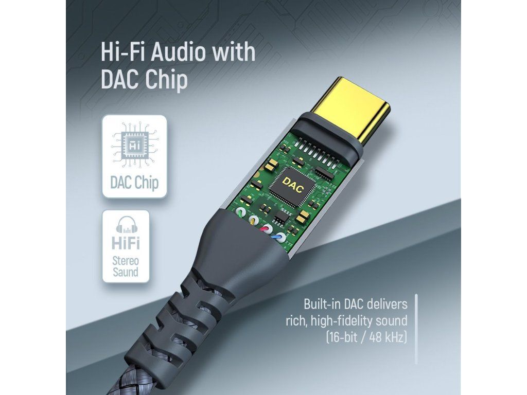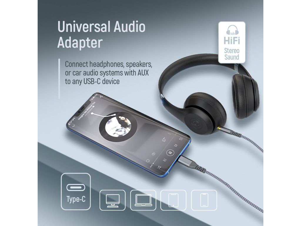 Adaptér umožňuje připojení sluchátek, autorádia, reproduktorů a dalších audio zařízení s 3,5mm AUX vstupem ke smartphonům, tabletům a dalším zařízením s USB-C portem. Díky integrovanému DAC chipu zajišťuje čistý a kvalitní stereo zvuk bez ztráty kvality.